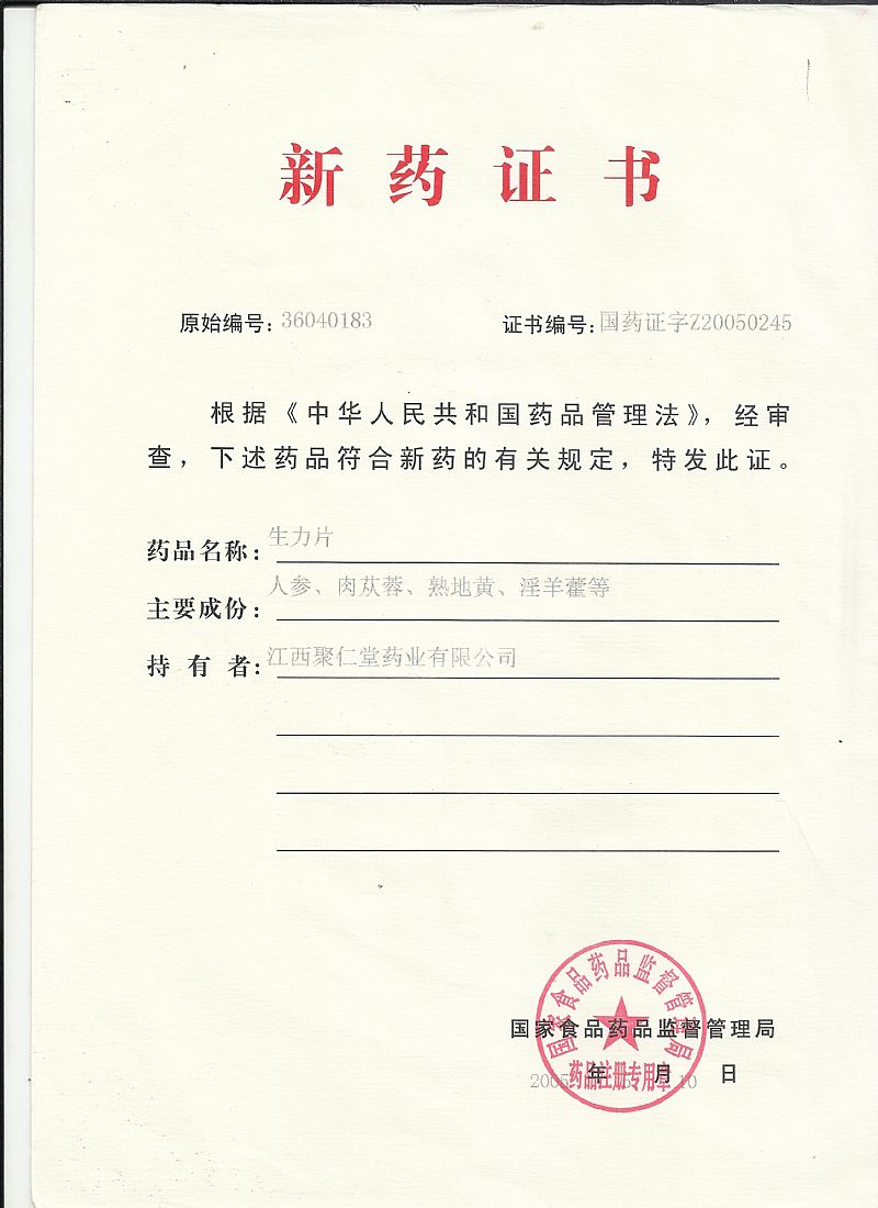 | 產(chǎn)品賣點(diǎn) | (1)中華人民共和國產(chǎn)品。 (2)中華人民共和國專利產(chǎn)品。 (3)有國藥證字Z20050245號新藥證書。 (4)中藥制劑。 (5)能夠提高免疫功能、減少感冒、安神 益智的補(bǔ)腎壯陽藥。主治陽瘺、早泄、 遺精、性欲減退等。 (6)只做終端,實(shí)行區(qū)域保護(hù)、價格維護(hù)。 (7)**空間大,長期合作,互利共贏。 (8)獲2005年江西省新產(chǎn)品證書。 |