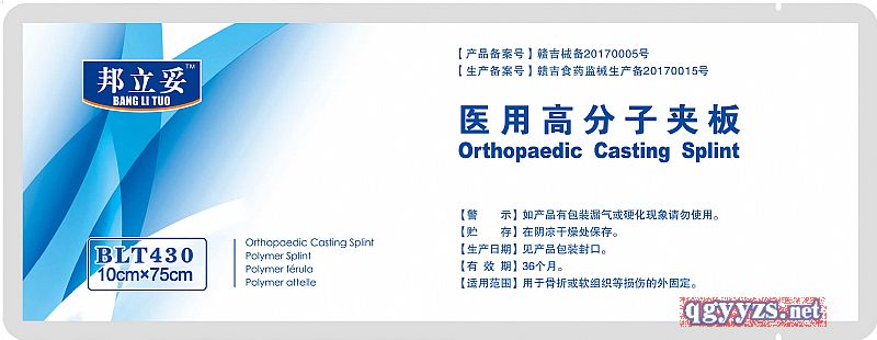 | 補(bǔ)充說明 | 醫(yī)用高分子夾板具有使用方便、硬化快、硬度高、重量輕、透氣性好、不怕水、透X射線攝片不用拆除、清潔環(huán)保、舒適等優(yōu)點(diǎn)。不粘手,一次性使用,符合醫(yī)用環(huán)保要求。醫(yī)生操作更簡(jiǎn)便、患者使用更舒適。 【使用方法】 1.根據(jù)整形的部位選擇相應(yīng)規(guī)格的夾板。 2.打開一袋包裝袋,把夾板外側(cè)吸水無紡布朝下放在常溫(20℃~25℃/68~77℉)的水中4~8*鐘,同時(shí)擠壓2~3次,使外側(cè)無紡布均勻充分的吸收水。 3.取出后擠出或用干毛巾卷繞夾板,除去多余水份。 4.將夾板的內(nèi)側(cè)無紡棉層覆蓋在需固定部位,根據(jù)需要塑型,用紗布繃帶或彈性繃帶纏繞固定。 5.操作一般在3~5**內(nèi)完成,約10**開始硬化,20**后完全固化,30**后可承受重量。 7.固定部位有皮外傷或需操作時(shí)間更長(zhǎng)時(shí),夾板可先不浸濕水,直接進(jìn)行固定,用紗布繃帶或彈性繃帶纏繞固定后,可在外層噴灑水來加速硬化速度; 8.夾板可輕松拆除。 |