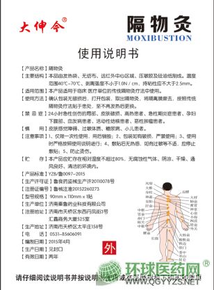 | 使用方法 | 確認報裝無破損后,打開包裝,取出隔物灸,將隔離膜撕去,按照傳統(tǒng)隔物灸療法貼于患處,至不再發(fā)熱后更換 |