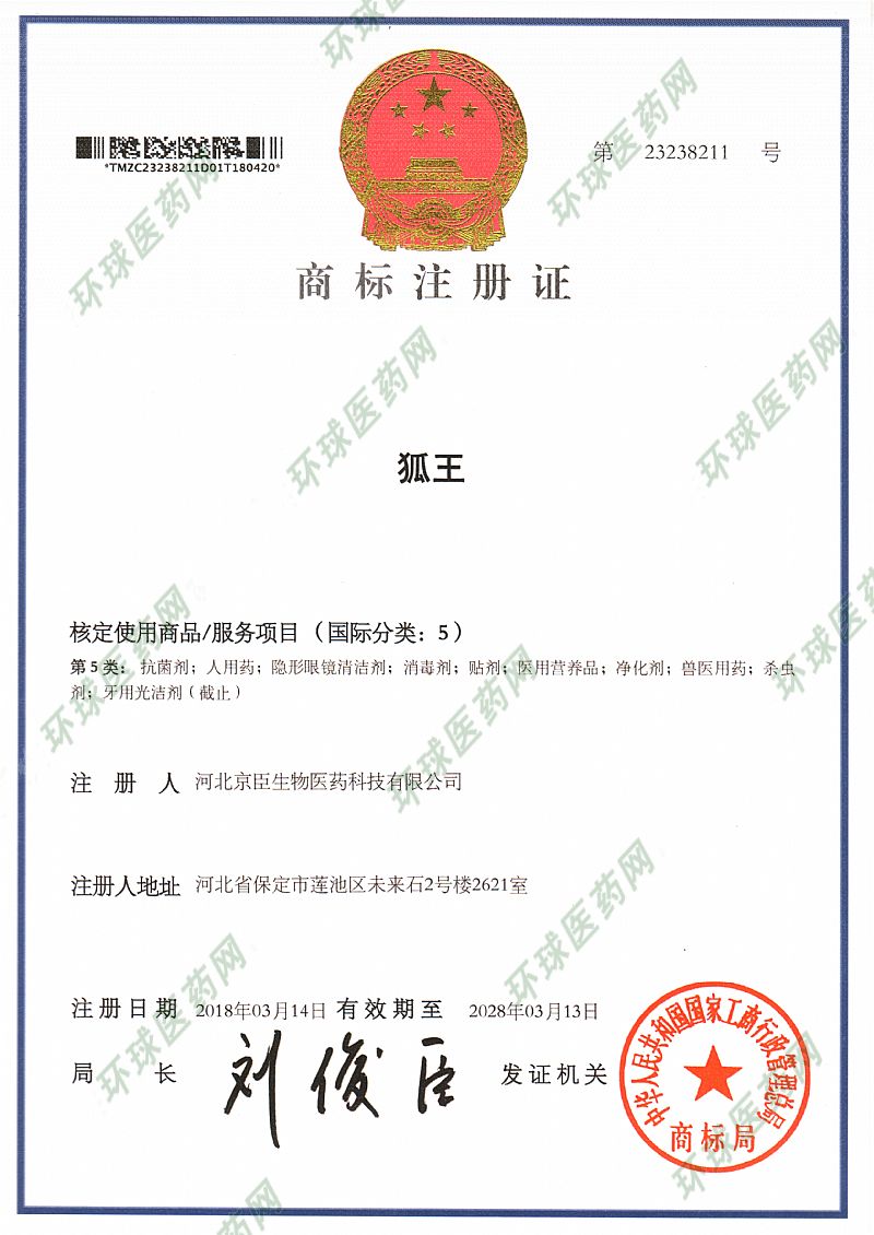 | 注冊商標(biāo) | 狐王(I型)抑菌噴霧劑 |