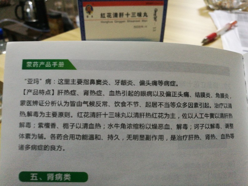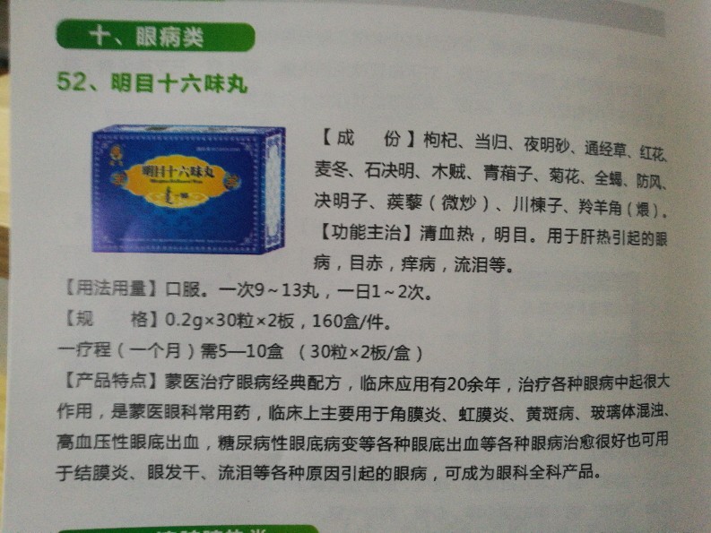 | 產(chǎn)品賣點 | 醫(yī)保產(chǎn)品。 十三味蒙中藥組方而成,可聯(lián)合明目十六味丸治療眼病療效確切,經(jīng)過臨床驗證。 清肝熱,解毒。如中毒性肝炎,酒精肝,脂肪肝。 用于肝功能衰退,配毒癥,腰腎損傷,尿頻,尿血。尤其對血熱引起的眼病有效。 |