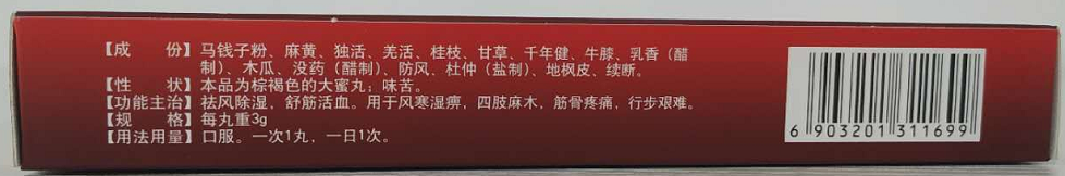 | 主要成分 | 馬錢子粉,麻黃,獨(dú)活,羌活,桂枝,甘草,千年健,牛膝,乳香(醋制),木瓜,沒藥(醋制),防風(fēng),杜仲(鹽制),地楓皮,續(xù)斷。 |