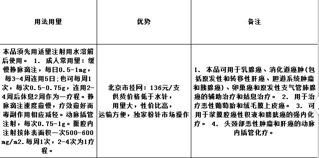 【功能主治】本品可用于乳腺癌、消化道癌腫(包括原發(fā)性和轉(zhuǎn)移性肝癌、膽道系統(tǒng)腫瘤和胰腺癌)、卵巢癌和原發(fā)性支氣管肺腺癌的輔助治療和姑息治療;用于治療惡性葡萄胎和絨毛膜上皮癌;可用于漿膜腔癌性積液和膀胱癌的強(qiáng)內(nèi)化療;頭頸部惡性腫瘤和肝癌的動(dòng)脈內(nèi)插管化療。