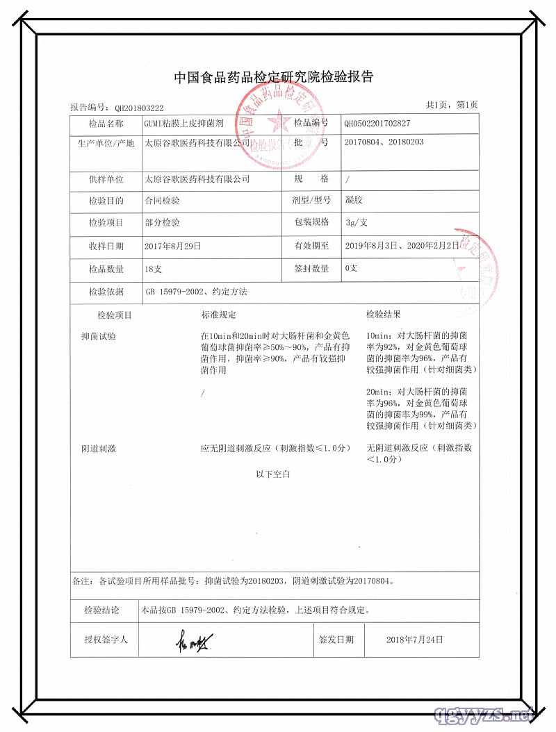 | 補充說明 | 谷米®GUMI粘膜上皮抑菌劑 【產品名稱】谷米®GUMI粘膜上皮抑菌劑 【商品名稱】谷米® 抑菌凝膠 【主要抑菌成份和含量】聚六亞甲基雙胍0.2%(w/w)、N-椰子油脂肪酸;-L-精氨酸乙基酯-DL-吡咯烷酮羧酸鹽、葡聚糖、苦參堿、莪術油、卡波姆 、胡蘿卜素提取物(Daucus carota)、茶樹油等。 【抑制微生物類別】人乳頭瘤病毒(HPV)、金黃色葡萄球菌、大腸桿菌、白色念珠菌。 使用方法:一次1支,隔日一次。采取仰臥位,抬高臀部,取下推注器前端套筒作為推桿,將本品載有凝膠的推注器緩緩插入陰道,利用推桿將本品推入陰道。 皮膚適量一日3--4次。 【注意事項】1、不得用于性生活中對性病的預防; 2、本品外用,禁止口服。 3、孕婦及月經期婦女禁用。 4、避免和激素產品一起使用。 5、一次性使用,包裝破損,請勿使用。 【貯存方式】常溫、置陰涼干燥處。 【劑 型】凝膠 【包裝規(guī)格】3g*1/支/盒 【有 效 期】二年 【衛(wèi)生許可證】(蘇)衛(wèi)消證字(2016)第0038號 【執(zhí)行標準】Q/320116 SDYY 058-2018 【生產企業(yè)】南京三盾藥業(yè)有限公司 【生產地址】南京市六合區(qū)中山科技園科創(chuàng)大道9號C1幢一樓 【郵編】211500 |