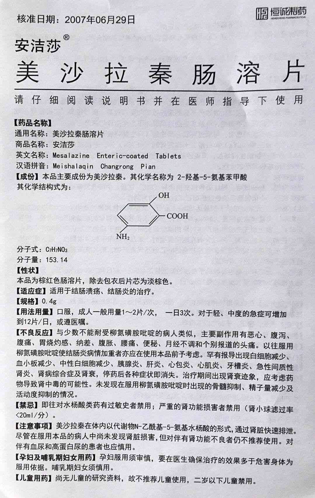 | 通用名稱 | 美莎拉秦腸溶片 |