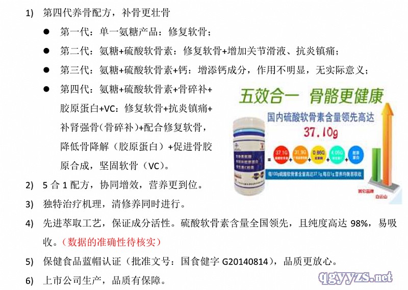| 主要成分 | 主要原料:硫酸軟骨素、D-氨基葡萄糖鹽酸鹽、膠原蛋白、骨碎補提取物、維生素C!緲(biāo)志性成分及含量】每100g含:硫酸軟骨素37.1g、D-氨基葡萄糖鹽酸鹽31.9、總黃酮0.86g、維生素C4.05g【保健功能】增加骨密度 |