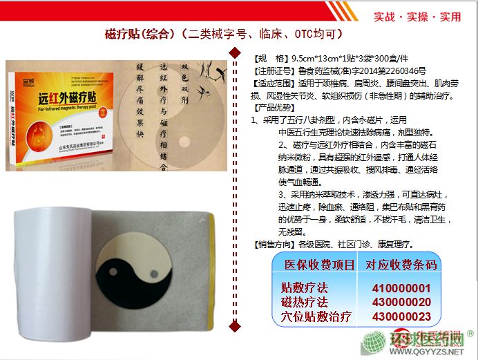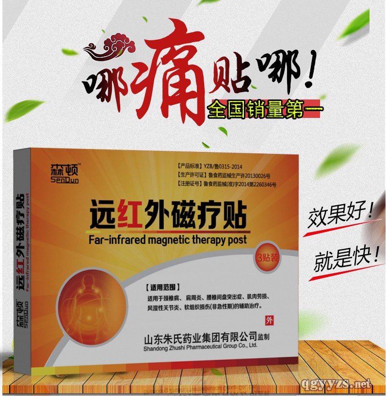 | 補(bǔ)充說明 | 1、磁療與遠(yuǎn)紅外療相結(jié)合,內(nèi)含豐富的磁石納米微粉, 2、采用納米萃取技術(shù),柔軟舒適,不拔汗毛,清潔衛(wèi)生,無殘留。 3、采用了五行八卦劑型,內(nèi)含永磁片。 【規(guī) 格】7cm×10cm×3貼×2袋×300盒/件 【注冊(cè)證號(hào)】魯食藥監(jiān)械(準(zhǔn))字2014第2260346號(hào) 【適應(yīng)范圍】適用于頸椎病、肩周炎、腰間盤突出、肌肉勞損、風(fēng)濕性關(guān)節(jié)炎、軟組織損傷(非急性期)的輔助治療。 |