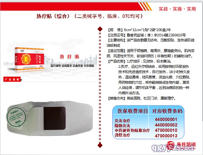 | 補充說明 | 【規(guī) 格】9cm*11cm*1貼*2袋*200盒/件 【注冊證號】魯食藥監(jiān)械(準(zhǔn))字2014第2260610號 【主要結(jié)構(gòu)】該產(chǎn)品由敷膜無紡布、壓敏膠貼、發(fā)熱袋及硅油紙制成 【適應(yīng)范圍】適用于頸椎病、肩周炎、腰椎盤突出。肌肉勞損、風(fēng)濕性關(guān)節(jié)炎、軟組織損傷(非急性期)的輔助治療。 |