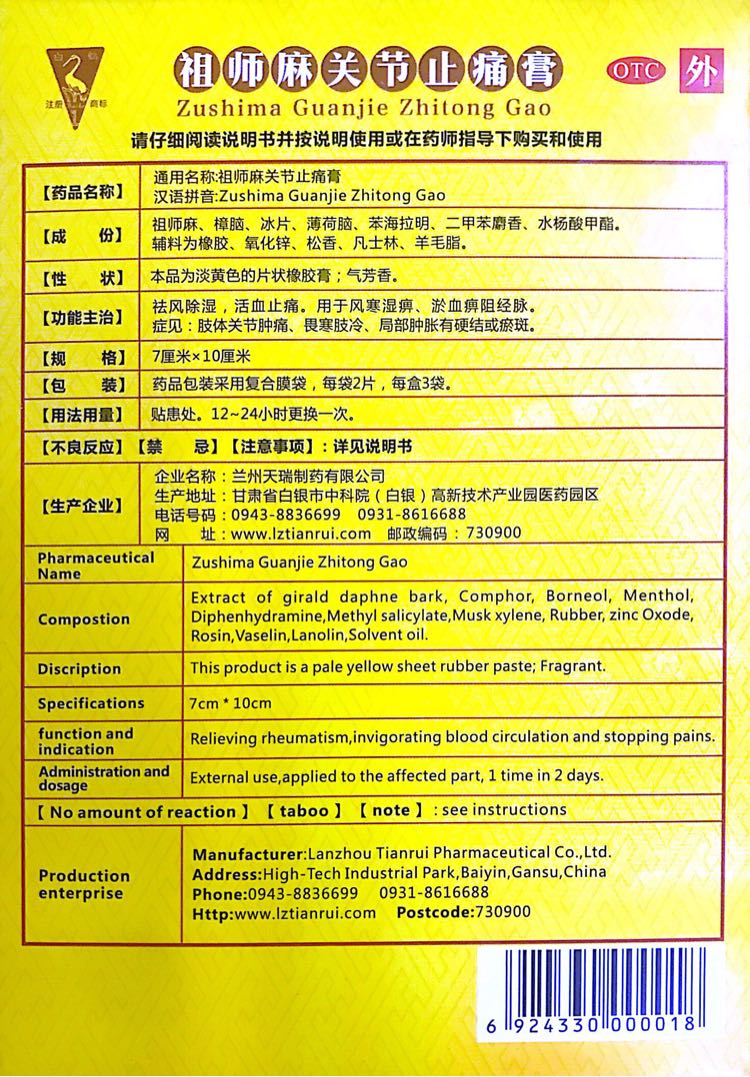 | 產(chǎn)品名稱 | 祖師麻關(guān)節(jié)止痛膏 |