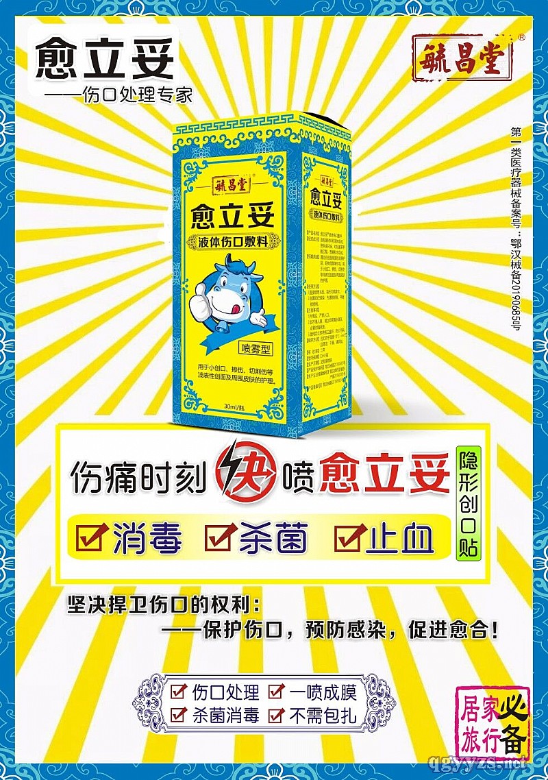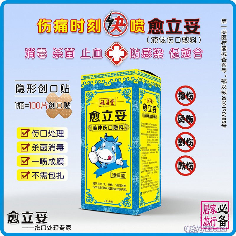 | 產(chǎn)品賣點 | 傷痛時刻快噴“愈立妥”! 殺菌消毒 一噴成膜 不需包扎 市場成熟!價格低!上量快! |