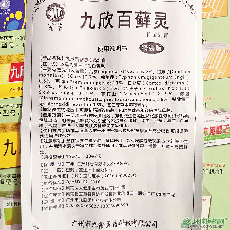 產(chǎn)品名稱: 九欣百蘚靈抑菌乳膏
