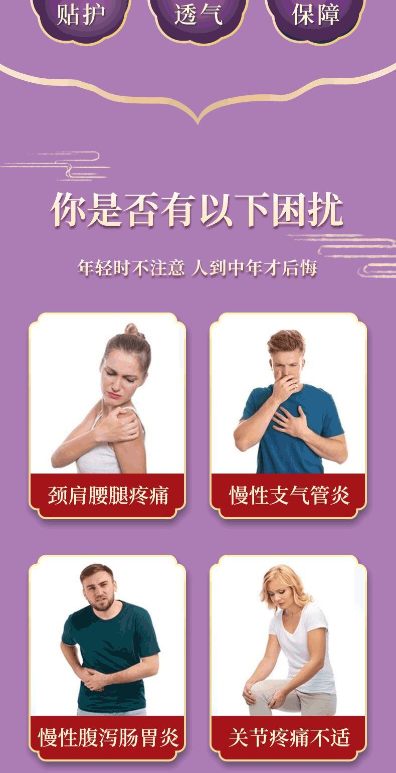 | 產(chǎn)品用途 | 詳見包裝說明以及內(nèi)置說明書【產(chǎn)品名稱】穴位貼敷治療貼 【結(jié)構(gòu)及組成】本品由遠紅外陶瓷粉、丙烯酸壓敏膠、水刺無紡布、不銹鋼珠及離型 紙制成。穴位貼敷治療貼的壓敏膠布剝離強度不小于1.0N/cm,持粘性應(yīng) 不大于2.5mm,遠紅外發(fā)射波長范圍8μm—15μm,法向比輻射率≥75%。 【適用范圍】本品針對人體特定穴位,對中醫(yī)穴位起刺激作用。 【使用方法】1、清潔相應(yīng)穴位,先以拇指依次揉按相應(yīng)穴位,每次1~2分鐘,范圍由小 到大。力量由輕到重,探尋敏感點。 2、確認(rèn)包裝無破損后,打開包裝,取出穴位貼敷治療貼,將貼劑的隔離 膜撕去,以鋼珠對準(zhǔn)相應(yīng)穴位敏感點貼壓,1片/穴、天,每日適度按 壓3~5次,每次3~5分鐘,1個療程為10天,療程間隔2~3天。 【產(chǎn)品禁忌癥】糖尿病、高熱患者慎用;孕婦、皮膚潰爛處禁用。 |