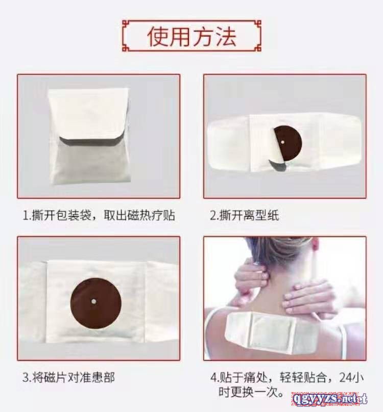| 使用方法 | 清潔患處,確認包裝無破損后,打開包裝,取出磁療貼巴布劑,將貼劑的隔離膜撕去,貼于患處,每24小時更換一次。 |