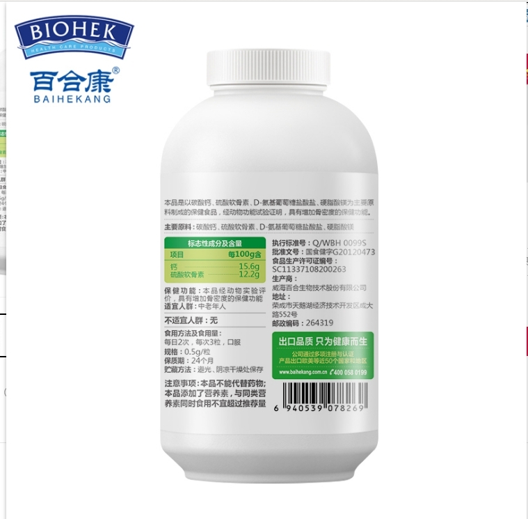 | 補(bǔ)充說明 | 本產(chǎn)品不代替任何藥物,原料,碳酸鈣,硫酸軟骨素,明膠,純化水等。 |