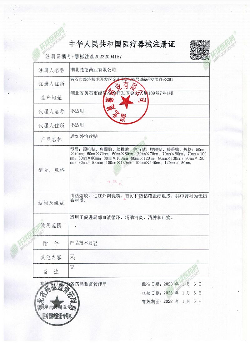 | 補(bǔ)充說(shuō)明 | 【產(chǎn)品名稱】遠(yuǎn)紅外治療貼 【產(chǎn)品規(guī)格】90mm×120mm。 【產(chǎn)品型號(hào)】頸椎貼。 【結(jié)構(gòu)及組成】由熱熔膠、遠(yuǎn)紅外陶瓷粉、背襯和防粘覆蓋紙組成。其中背襯為無(wú)紡布材質(zhì)。 【產(chǎn)品性能】本品遠(yuǎn)紅外法向發(fā)射率應(yīng)≥85%。 【適用范圍】適用于促進(jìn)局部血液循環(huán)、輔助消炎、消腫和止痛。 【使用方法】外用,將所貼部位皮膚清洗干凈,打開(kāi)包裝,取出產(chǎn)品,揭去防粘紙,貼于患處。 【禁忌證】 1、有開(kāi)放性傷口者禁用; 2、植入心臟起搏器及金屬異物局部禁用;嚴(yán)重心,肝,肺,腎衰竭患者禁用; 3、孕婦下腹部禁用,哺乳期婦女慎用; 4、出血及有出血傾向者禁用; 5、皮膚破損、皮膚病,對(duì)產(chǎn)品過(guò)敏者禁用; 6、體質(zhì)極度虛弱者禁用。 【注意事項(xiàng)】 1、本品為一次性使用,勿重復(fù)使用; 2、本產(chǎn)品為外用,禁止口服; 3、皮膚過(guò)敏者,如出現(xiàn)瘙癢、皮疹等,應(yīng)立即停止使用。 【貯藏及運(yùn)輸】密封、置室內(nèi)干燥處。包裝好的產(chǎn)品在運(yùn)輸過(guò)程中應(yīng)防曬,防潮,并**產(chǎn)品包裝在運(yùn)輸途中不受損壞。 【有效期】?jī)赡?br>【生產(chǎn)許可證編號(hào)】鄂藥監(jiān)械生產(chǎn)許20221170號(hào) 【醫(yī)療器械注冊(cè)證編號(hào)】鄂械注準(zhǔn)20232094157 【醫(yī)療器械產(chǎn)品技術(shù)要求編號(hào)】鄂械注準(zhǔn)20232094157 【注冊(cè)人/生產(chǎn)企業(yè)/售后服務(wù)單位】湖北楚德藥業(yè)有限公司 【注冊(cè)人住所】黃石市經(jīng)濟(jì)技術(shù)開(kāi)發(fā)區(qū)金山大道189號(hào)B棟研發(fā)樓辦公201 【生產(chǎn)地址】湖北省黃石市經(jīng)濟(jì)技術(shù)開(kāi)發(fā)區(qū)金山大道189號(hào)7號(hào)4樓 【聯(lián)系電話】 0714-8660120 13349828866 【說(shuō)明書(shū)編制/修訂日期】2023年1月6日 |