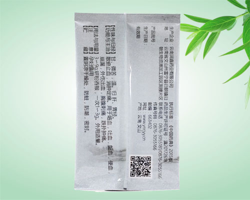 | 產(chǎn)品用途 | 散瘀止血,消腫定痛。用于咯血、吐血、衄學、便血、崩漏、外傷出血、胸腹刺痛、跌撲腫痛。 |