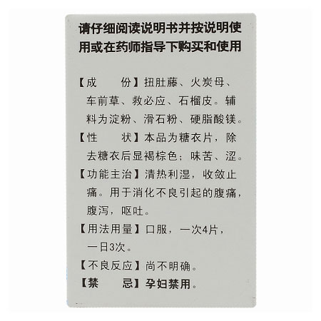 | 主要成分 | 扭肚藤、火炭母、車(chē)前草、救必應(yīng)、石榴皮。 |