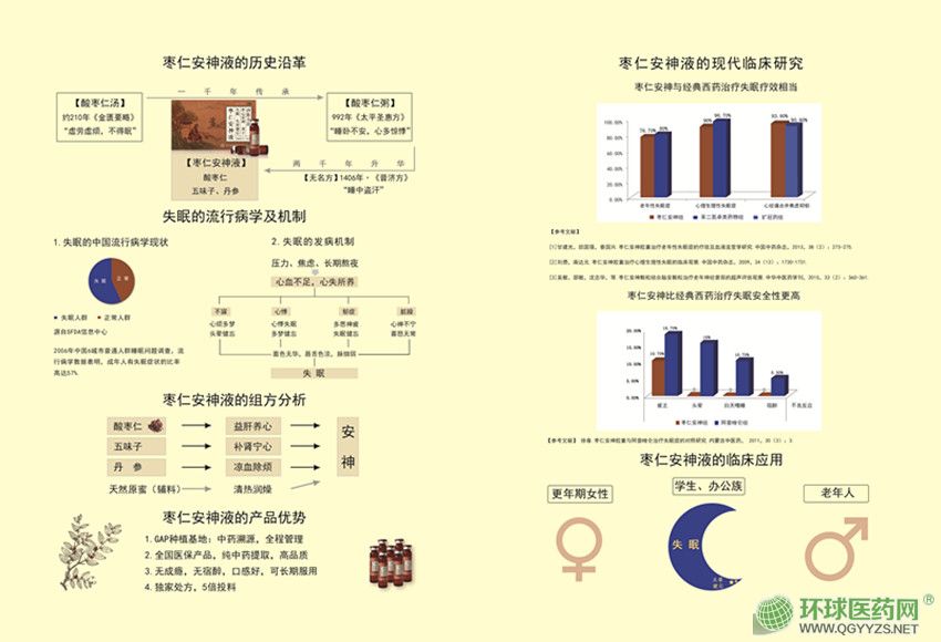 | 產(chǎn)品賣點(diǎn) | 全國醫(yī)保產(chǎn)品,高品質(zhì)優(yōu)質(zhì)配方,是同類競品中療優(yōu)質(zhì)的口服液 超聲提取,10倍投料與同種競品,效果好,(其他競品為合劑水提。; 無成癮,無宿醉,口感好,可以長期服用補(bǔ)心安神。 用于失眠、頭暈,健忘。 市場前景可觀。 |