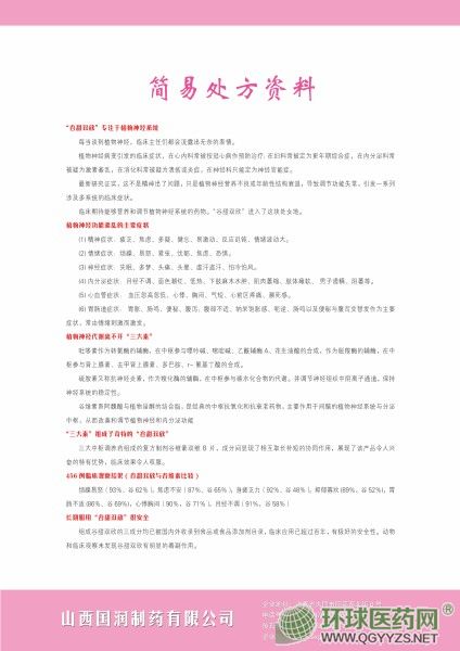 | 補充說明 | 456例臨床觀察結(jié)果(谷甜雙欣與谷維素比較) 煩燥易怒(93*,谷62*),焦慮不安(87*,谷65*),身疲乏力(92*,谷48*),抑郁寡歡(89*,谷52*),胃腸不適(86*,谷69*),心悸胸悶(90*,谷71*)月經(jīng)不調(diào)(91*,谷58*) |