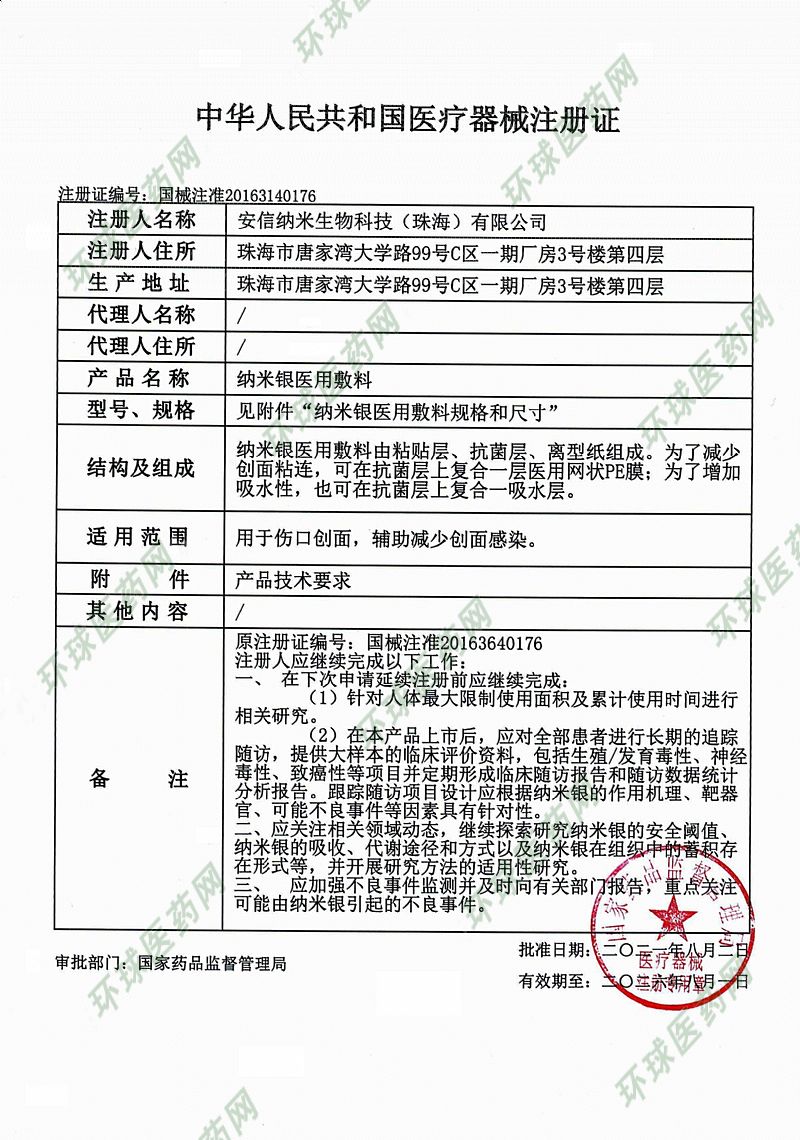 產品名稱: 納米銀醫(yī)用敷料(三類醫(yī)療器械)