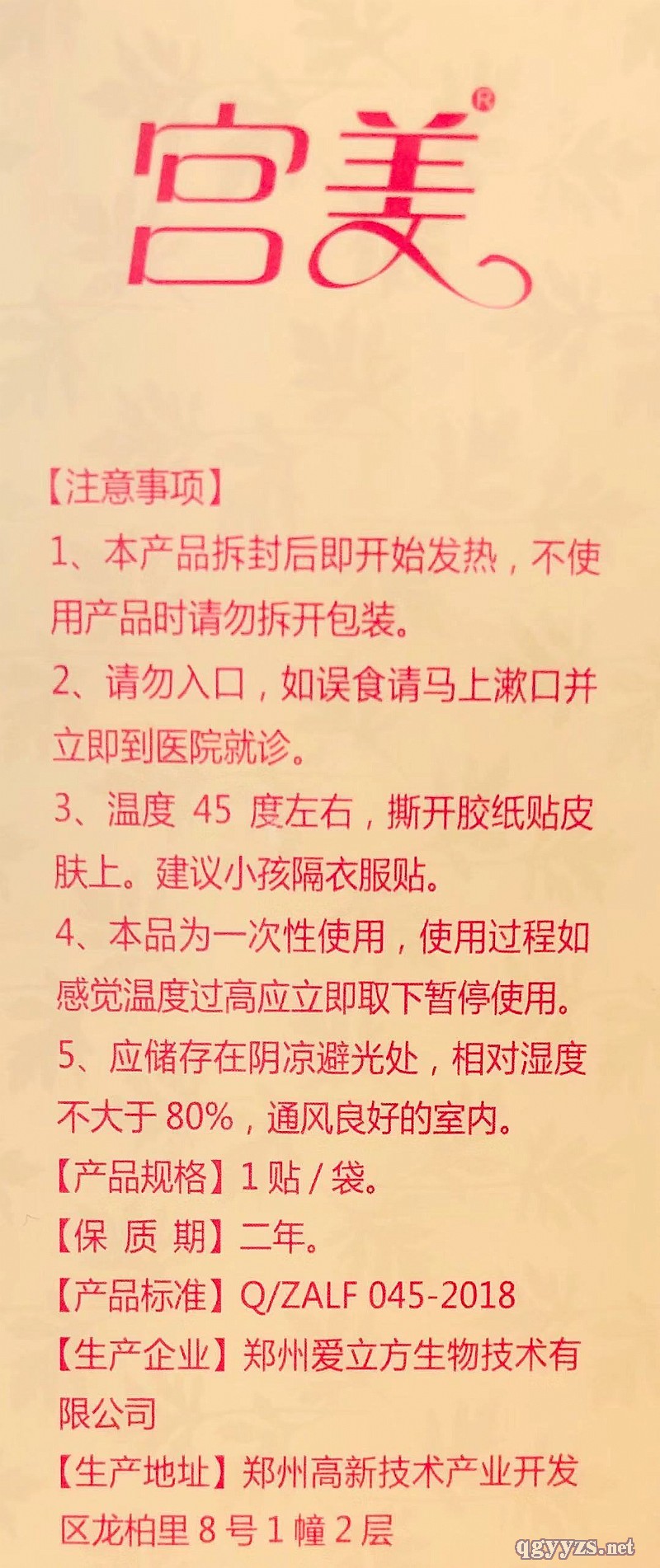 | 補充說明 | [產(chǎn)品名稱]:竹酢生姜艾灸暖宮貼 [主要成分]:艾葉、生姜、竹酢、紅花、食鹽、蒼術、獨活、黃芪、地黃、活性炭、電氣石粉、磁 石粉、香附、吳茱萸、肉桂、當歸、川芎、白芍、續(xù)斷等。 [作用機理]:本品接觸空氣后自身能散發(fā)熱量加速艾粉包吸收,可促進局部血液循環(huán),對于緩解胃部 、頸部、肩部、腰部、腿部、髖部、背部、四肢關節(jié)部、足底、腹部等部位的疼痛以及女性宮寒均 具有輔助以及保養(yǎng)的作用。 [適宜人群]:適用于胃部、頸部、肩部、腰部、腿部、髖部、背部、四肢關節(jié)部、足底、腹部等部位 的疼痛以及女性宮寒等人群。 [不適宜人群]:孕婦、兒童、外傷、皮膚潰爛、艾草過敏者禁止使用。 [使 用方 法]:本產(chǎn)品接觸空氣自動發(fā)熱,開袋即用。使用時貼于痛處或小腹部,持續(xù)時間6-8小時。 每日一貼。 [注意事項] 1、本產(chǎn)品拆封后即開始發(fā)熱,不使用產(chǎn)品時請勿拆開包裝。 2、請勿入口,如誤食請馬上漱口并立即到醫(yī)院就診。 3、溫度45度左右,撕開膠紙貼皮膚上。建議小孩隔衣服貼。 4、本品為一-次性使用,使用過程如感覺溫度過高應立即取下暫停使用。5、應儲存在陰涼避光處,相 對濕度不大于80* ,通風良好的室內(nèi)。 [產(chǎn)品規(guī)格] 1貼/袋。 保質(zhì)期 二年 [不適宜人群]:孕婦、兒童、外傷、皮膚潰爛、艾草過敏者禁止使用。 [使 用方 法]:本產(chǎn)品接觸空氣自動發(fā)熱,開袋即用。使用時貼于痛處或小腹部,持續(xù)時間6-8小時。 每日一貼。 [產(chǎn)品標準] Q/ZALF 045-2018 [生產(chǎn)企業(yè))鄭州愛立方生物技術有限公司 [生產(chǎn)地址)鄭州高新技術產(chǎn)業(yè)開發(fā)區(qū)龍柏里8號1幢2層 [咨詢熱線] 0371-60961096 [聯(lián)系電話] 曹經(jīng)理 18603812220 秦經(jīng)理18039519867 喻經(jīng)理19913875788 喬經(jīng)理 18937132342 曹經(jīng)理 18037311680 陳經(jīng)理15538711170 |