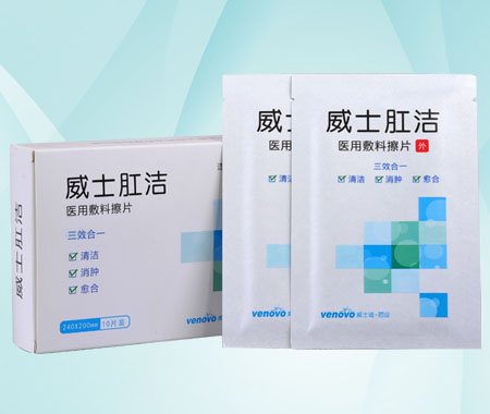 | 補充說明 | 醫(yī)用敷料擦片三效合一 :清潔、消毒、愈合。 威士肛潔醫(yī)用敷料擦片—*方便的創(chuàng)新產品 威士肛潔為濕敷擦拭型,是由接觸創(chuàng)面的敷墊物、浸潤液體和鋁塑紙等包材組成,敷墊物由醫(yī)用無紡布或棉條或泡棉或海綿或濕強紙等組成,浸潤液體為含復合季銨鹽類德國食品級的高滲生理鹽溶液。是便于患者能隨時隨地方便使用的創(chuàng)新產品。威士肛潔產品專利號為:ZL201220321378.8 【注意事項】 1.置于兒童不宜觸及處。 2. 外用不可吞服。 3. 如遇過敏反應停止使用。 |