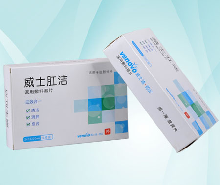 | 補(bǔ)充說明 | 醫(yī)用敷料擦片三效合一 :清潔、消毒、愈合。 威士肛潔醫(yī)用敷料擦片—*方便的創(chuàng)新產(chǎn)品 威士肛潔為濕敷擦拭型,是由接觸創(chuàng)面的敷墊物、浸潤(rùn)液體和鋁塑紙等包材組成,敷墊物由醫(yī)用無紡布或棉條或泡棉或海綿或濕強(qiáng)紙等組成,浸潤(rùn)液體為含復(fù)合季銨鹽類德國食品級(jí)的高滲生理鹽溶液。是便于患者能隨時(shí)隨地方便使用的創(chuàng)新產(chǎn)品。威士肛潔產(chǎn)品專利號(hào)為:ZL201220321378.8 |
