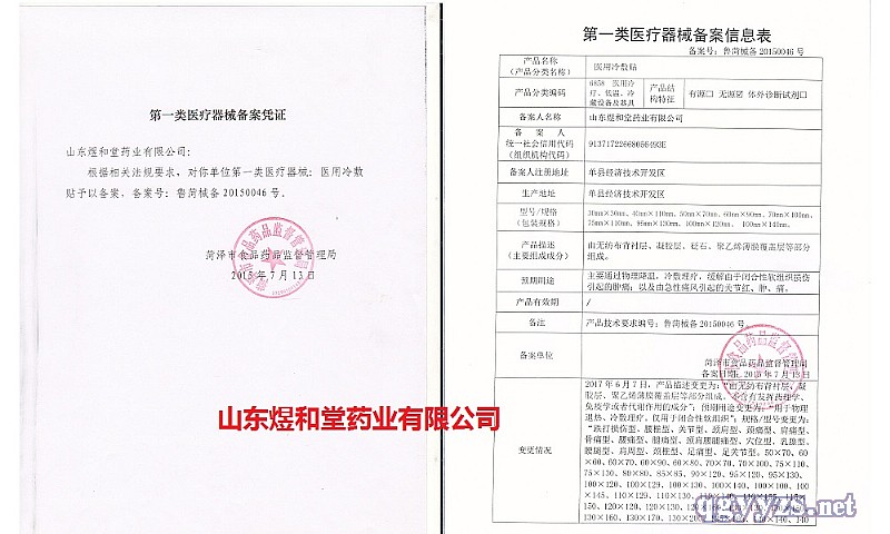 | 其它說明 | 【產(chǎn)品名稱】醫(yī)用冷敷貼 【產(chǎn)品描述】由無紡布背襯層、凝膠層、砭石、聚乙烯薄膜覆蓋層等部分組成。 【預(yù)期用途】主要通過物理降溫,冷敷理療,緩解由于閉合性軟組織損傷引起的腫痛;以及由急性痛風(fēng)引起的關(guān)節(jié)紅、腫、痛。 【使用方法】清潔患處,確認(rèn)包裝無破損后,打開包裝,取出醫(yī)用冷敷貼,將貼劑的隔離膜撕去,貼于患處,每24小時(shí)更換一次。 【產(chǎn)品禁忌癥】孕婦、皮膚破損、開放性傷口均禁用,過敏體質(zhì)者慎用。 【貯 存】密閉、置陰涼、干燥處保存。 【備案號(hào)】魯菏械備20150046號(hào) 【注冊(cè)證編號(hào)】魯菏械備20150046號(hào) 【生產(chǎn)許可證】魯食藥監(jiān)械生產(chǎn)許20130026號(hào) 【型號(hào)規(guī)格】95mm×130mm×1貼×3袋 【生產(chǎn)單位】山東煜和堂藥業(yè)有限公司 【生產(chǎn)地址】單縣經(jīng)濟(jì)技術(shù)開發(fā)區(qū) 【生產(chǎn)日期】見封口 【有效日期】兩年 請(qǐng)仔細(xì)閱讀產(chǎn)品說明書或者在醫(yī)務(wù)人員的指導(dǎo)下購買和使用 煜和堂醫(yī)用冷敷貼凝膠層為親水高分子材料,含70%以上的水分。體表皮膚溫度傳導(dǎo)到本產(chǎn)品的凝膠層,熱量被凝膠內(nèi)水分子吸收,通過水分的蒸發(fā)帶走大量的熱量,可迅速地降低體表皮膚局部溫度,減輕局部皮膚的灼熱感、疼痛感和敏感性,從而起到物理降溫及冷敷理療的效果。 山東煜和堂藥業(yè)有限公司承接貼劑加工、多種劑型貼劑oem代工,山東煜和堂致力于貼劑貼劑的研發(fā)生產(chǎn),將持續(xù)打造品質(zhì)卓越的現(xiàn)代貼劑精品,服務(wù)社會(huì),服務(wù)人民,把綠色和健康帶給每一個(gè)人。 |