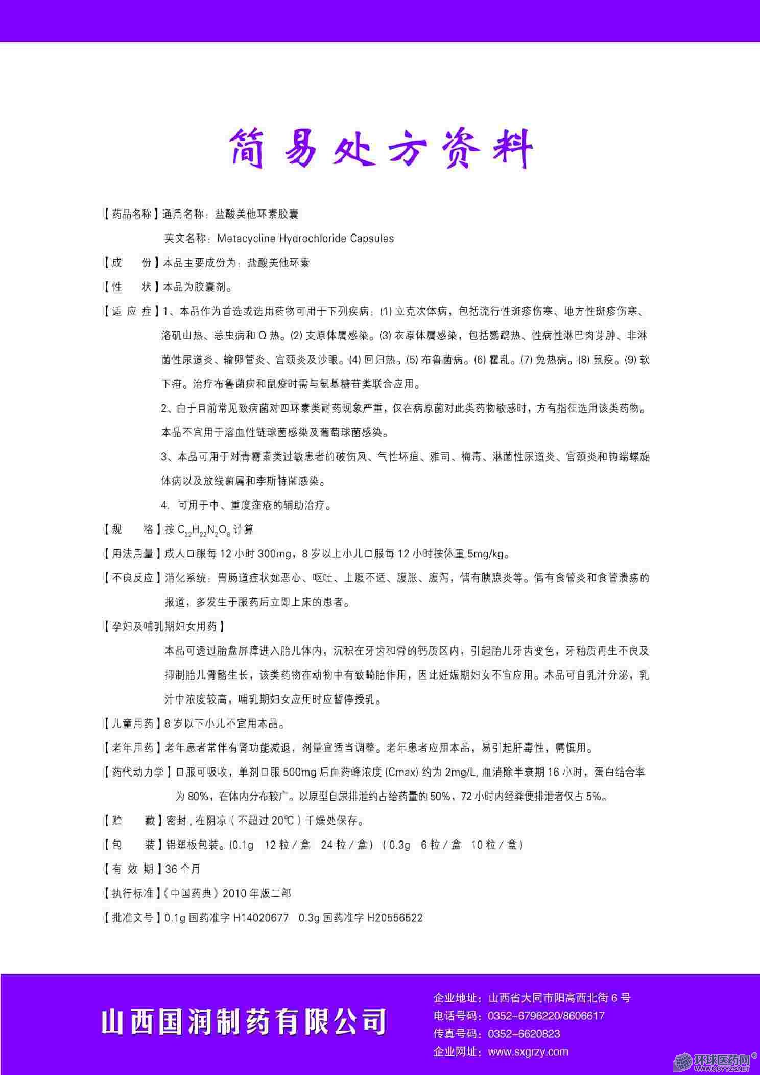 通用名稱: 鹽酸美他環(huán)素膠囊