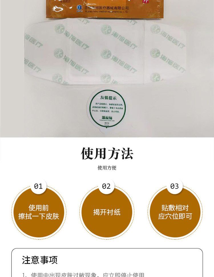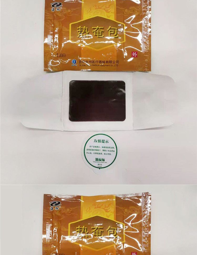| 使用方法 | 確認(rèn)包裝無破損后,打開包裝,取出熱奄包,將隔離膜撕去,按照傳統(tǒng)中藥熱奄療法貼于患處,至不再發(fā)熱后更換。 |