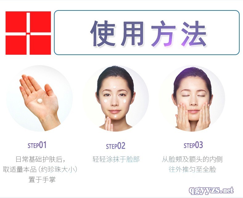 | 使用方法 | 日常基礎護膚后,取適量隔離霜(約珍珠大。┲糜谡菩,輕輕涂抹于臉部,從臉頰及額頭的內側往外推勻至全臉。 |