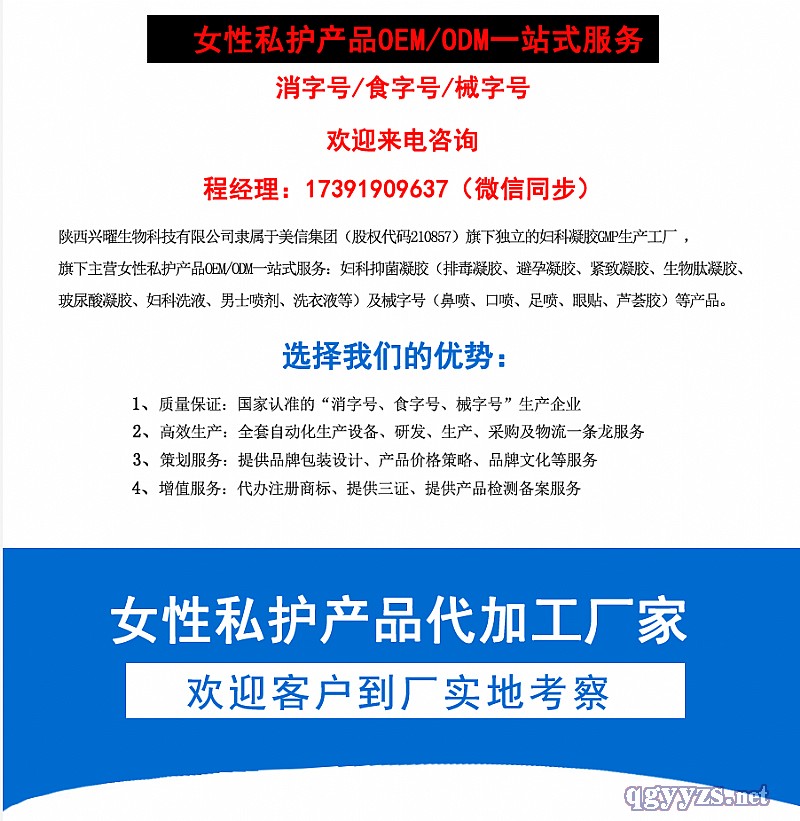 | 其它說明 | (消字號產(chǎn)品、成品、裸支、噴劑、貼劑等等)婦科凝膠生產(chǎn)廠家直銷 價格合理 有意者電話洽談! |