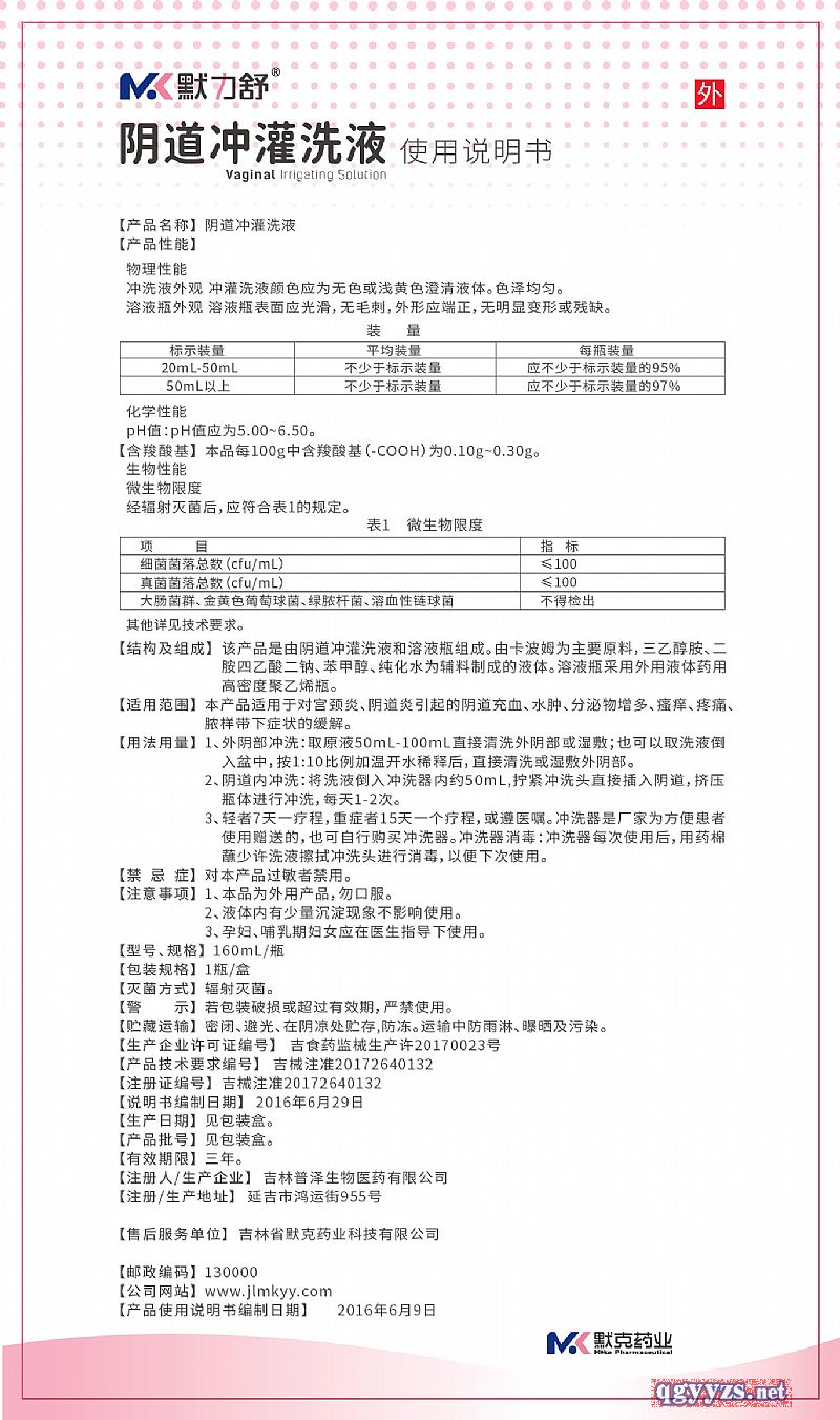 | 補(bǔ)充說明 | 【產(chǎn)品名稱】陰道沖灌洗液 【產(chǎn)品性能】 物理性能 沖洗器外觀沖灌洗液顏色應(yīng)為無色或淺黃色澄清液體。色澤均勻。 溶液瓶外觀溶液瓶表面應(yīng)光滑,無毛刺,外形應(yīng)端正,無明顯變形或殘缺。 裝量 標(biāo)示裝量每瓶裝量 20mL-50mL不少于標(biāo)示裝量應(yīng)不少于標(biāo)示裝量的95% 50mL以上不少于標(biāo)示裝量應(yīng)不少于標(biāo)示裝量的97% 化學(xué)性能 pH值:pH應(yīng)為5.00~6.50。 【含羧酸基】本品每100g中含羧酸基(-COOH)為0.10g-0.30g。 生物性能 微生物限度 經(jīng)輻射滅菌后,應(yīng)符合表1的規(guī)定。 表1微生物限度 項(xiàng)目指標(biāo) 細(xì)菌茵落總數(shù)(cfu/ml)≤100 真菌萄落總數(shù)(cfu/mL)≤100 大腸菌群、金黃色葡萄球菌、綠膿桿菌、溶血性鏈球菌不得檢出 其他詳見技術(shù)要求。 【結(jié)構(gòu)及組成】該產(chǎn)品是由陰道沖灌洗液和溶液瓶組成。由卡波姆為主要原料,三乙醇胺、二胺四乙酸二鈉、苯甲醇、純化水為輔料制成的液體。溶液瓶采用外用液體藥用高密度聚乙烯瓶。 【適用范圍】本產(chǎn)品適用于對(duì)宮頸炎、陰道炎引起的陰道充血、水腫、分泌物增多、瘙癢、疼痛、膿樣帶下癥狀的緩解。 【用法用量】1、外陰部沖洗:取原液50ml-100mL直接清洗外陰部或濕敷;也可以取洗液倒 入盆中,按1:10比例加溫開水稀釋后,真接清洗或濕敷外陰部。 2、陰道內(nèi)沖洗:將洗液倒入沖洗器內(nèi)約50mL,擰緊沖洗頭直接插入陰道,擠壓瓶體進(jìn)行沖洗,每天1-2次。 3、輕者7天一療程,重癥者15天一個(gè)療程,或遵醫(yī)囑。沖洗器是廠家為方便患者使用贈(zèng)送的,也可自行購買沖洗器。沖洗器消毒:沖洗器每次使用后,用藥棉蘸少許洗液擦拭沖洗頭進(jìn)行消毒,以便下次使用。 【禁忌癥】對(duì)本產(chǎn)品過敏者禁用。 【注意事項(xiàng)】1、本品為外用產(chǎn)品,勿口服。 2、液體內(nèi)有少量沉淀現(xiàn)象不影響使用。 3、孕婦、哺乳期婦女應(yīng)在醫(yī)生指導(dǎo)下使用。 【型號(hào)、規(guī)格】160mL/瓶 【包裝規(guī)格】1瓶/盒 【滅菌方式】輻射滅菌。 【警示】若包裝破損或超過有效期,嚴(yán)禁使用。 【貯藏運(yùn)輸】密閉、避光、在陰涼處貯存,防凍。運(yùn)輸中防雨淋、曝曬及污染。 【生產(chǎn)企業(yè)許可證編號(hào)】吉食藥監(jiān)械生產(chǎn)許20170023號(hào) 【產(chǎn)品技術(shù)要求編號(hào)】吉械注準(zhǔn)20172640132 【注冊證編號(hào)】吉械注準(zhǔn)20172640132 【說明書編制日期】2016年6月29日 【生產(chǎn)日期】見包裝盒。 【產(chǎn)品批號(hào)】見包裝盒。 【有效期限】三年。 【注冊人/生產(chǎn)企業(yè)】吉林普澤生物醫(yī)藥有限公司 【注冊/生產(chǎn)地址】延吉市鴻運(yùn)街955號(hào) |