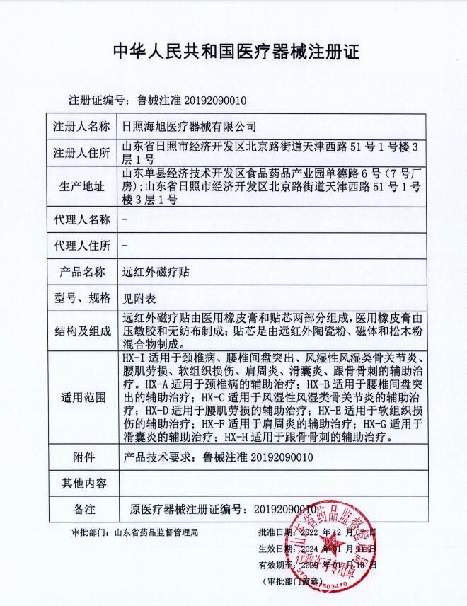 | 補(bǔ)充說(shuō)明 | 【適用范圍】磁療貼廠家招商磁系列產(chǎn)品--HX-Ⅰ適用于頸椎病、腰椎間盤突出、風(fēng)濕性風(fēng)濕類骨關(guān)節(jié)炎、腰肌勞損、軟組織損傷、肩周炎、滑囊炎、跟骨骨刺的輔助治療。 【結(jié)構(gòu)性能】該產(chǎn)品由醫(yī)用橡皮膏和貼芯兩部分組成,貼芯是由無(wú)紡布、遠(yuǎn)紅外陶瓷粉、磁體和松木粉混合物等組成。剝離強(qiáng)度≥1N/cm,持粘性≤2.5mm,遠(yuǎn)紅外發(fā)射波長(zhǎng)范圍8μm~15μm,法向比輻射率不小于80%,磁感應(yīng)強(qiáng)度不小于85mT。 【注意事項(xiàng)】1、**一次性使用,用后銷毀。 2、包裝如有破損,嚴(yán)禁使用。 3、使用時(shí)嚴(yán)格按照使用說(shuō)明進(jìn)行。 【禁忌癥】 裝有心臟起搏器患者、出血傾向性疾病患者、局部皮膚破損感染者、孕婦及過(guò)敏體質(zhì)者禁用。 |