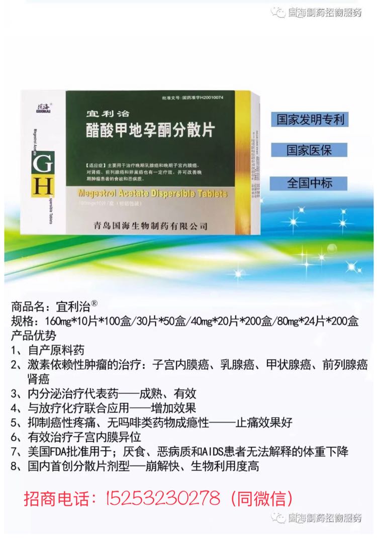 | 產(chǎn)品賣點 | 國家醫(yī)保甲類 160mg大劑量分散片為國內(nèi)**; 分散片劑型崩解速度快、溶出好、生物利用度更高; 作為甲羥孕酮替代品,不良反應小,肝損傷。 改善生活質(zhì)量、緩解期明顯延長; 國家專利產(chǎn)品 |