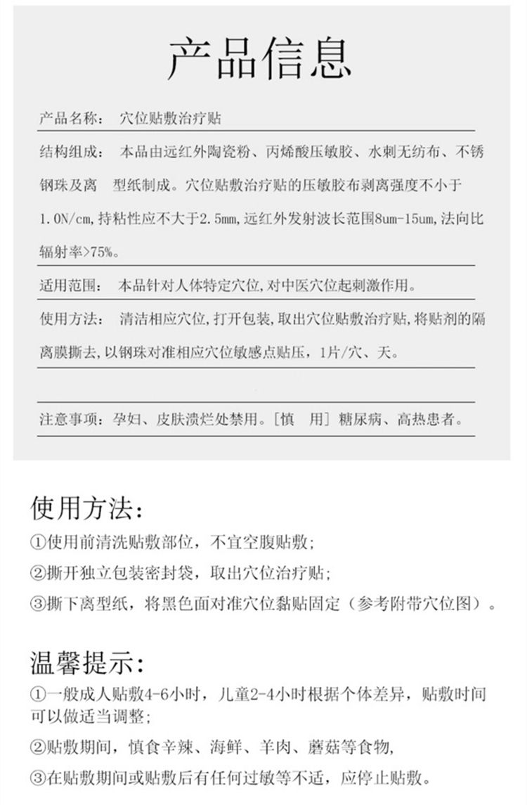 使用方法 將貼劑的隔離膜撕去,以鋼珠對準(zhǔn)相應(yīng)穴位敏感點貼壓,1片/穴、天,每日適度按壓3~5次,每次3~5**,1個療程為10天,療程間隔2~3天。(成人每次貼敷時間為6~8小時,兒童貼敷為2~4小時)