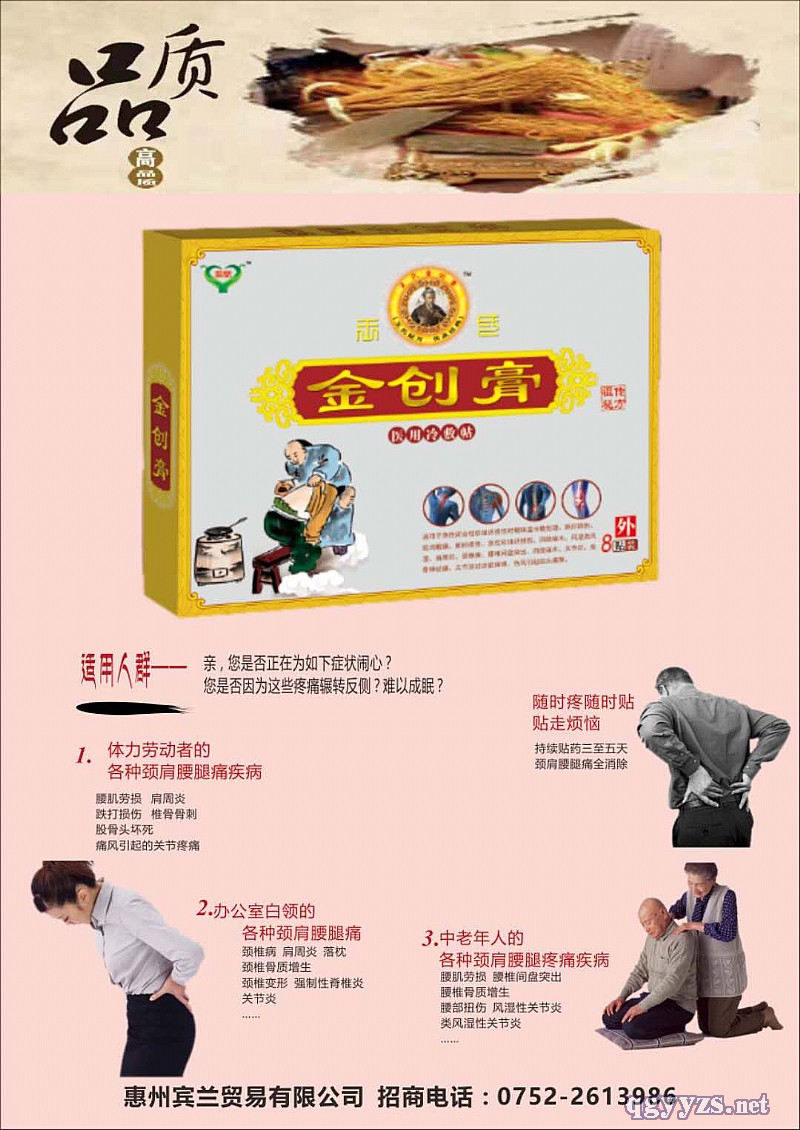 | 使用方法 | 可配合王氏骨風(fēng)寶使用,效果更佳,也可單獨(dú)使用。 外用,清潔患處皮膚,不適之處可先按揉,噴上王氏骨風(fēng)寶,揉至完全吸收,然后平整貼上王氏金創(chuàng)膏。單獨(dú)使用的話,直接在患處平整貼上就行。每貼貼敷6-8個(gè)小時(shí)。 |