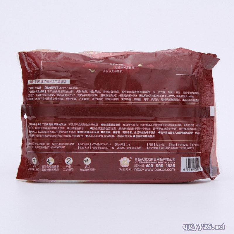 | 補(bǔ)充說明 | 產(chǎn)品說明: 產(chǎn)品規(guī)格:96mm*130mm 包裝:1片/袋*10袋/中包 使用期限:二年 注冊證號:魯食藥監(jiān)械(準(zhǔn))字2014第2260242號 許可證號:魯食藥監(jiān)械生產(chǎn)許20130093號 執(zhí)行標(biāo)準(zhǔn):YZB/魯0273-2014 貯存:應(yīng)置于陰涼干燥處存放,避免陽光直射 特別說明:兒童需在家長的知道、監(jiān)督下使用 產(chǎn)品性能: 本產(chǎn)品由高濃縮發(fā)熱料、無紡布袋、粘貼明膠、外包裝袋組成。其中高濃縮發(fā)熱料由鐵粉、水、活性炭、蛭石、食鹽、高分子吸水樹脂組成。產(chǎn)品自行發(fā)熱,升溫時間≤10min,溫度≤70℃,發(fā)熱持續(xù)時間≥8h,溫度**時間>持續(xù)時間的40%;粘帖明膠的持粘性不大于2.5mm,剝離強(qiáng)度≥1N/cm。 注意事項(xiàng): 本品拆封后即開始發(fā)熱,不使用產(chǎn)品時請勿拆開包裝。 1、請注意低溫燙傷。低溫燙傷是指:將比體溫高的發(fā)熱體長時間與身體接觸,會引起紅斑、水泡等癥狀的燙傷,如出現(xiàn)此癥狀請立即停止使用,建議請醫(yī)生就診。 2、防止低溫燙傷要注意:避免長時間敷于同一個地方;請不要就寢時實(shí)用;請不要和供暖設(shè)備一起使用。 3、請勿入口,如誤食請馬上漱口并立即請醫(yī)生就診。 4、孕婦及嬰幼兒忌用。 5、皮膚病、糖尿病、高熱患者、生活不能自理者慎用。 6、請不要放置在兒童能夠觸及的地方。 7、本品為一次性使用,使用過程如感覺溫度過高應(yīng)立即取下暫停使用。 8、本品不與皮膚直接接觸,請隔衣物實(shí)用。 9、請在有效期內(nèi)使用。 |