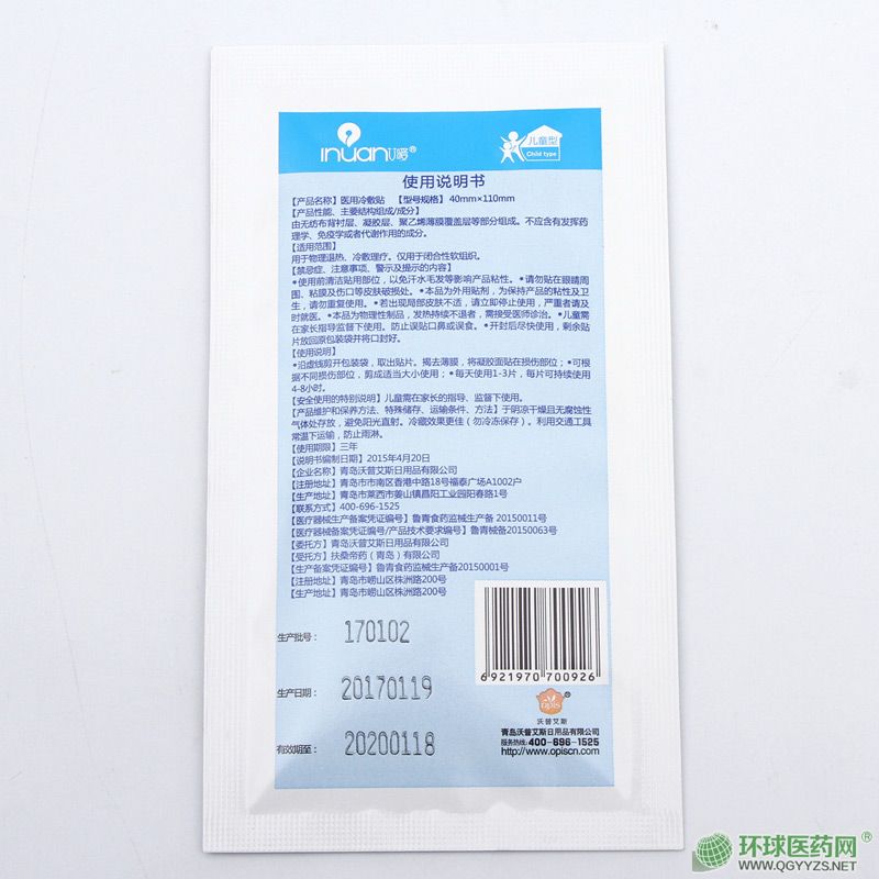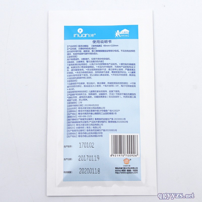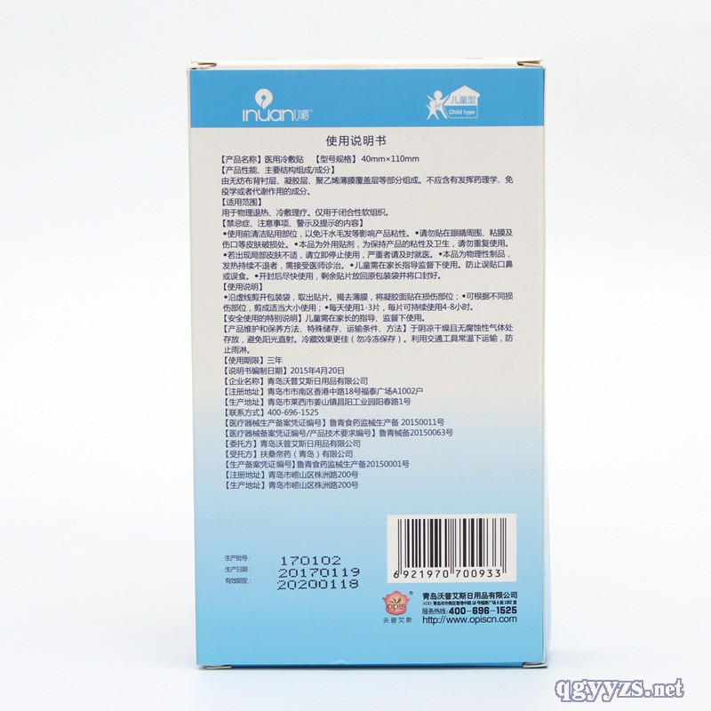 | 補(bǔ)充說明 | 型號規(guī)格:40mm*110mm 包裝規(guī)格:2貼/袋*3袋/盒 有效期:3年 注意事項: 使用前清潔使用部位并保持干燥,以增強(qiáng)產(chǎn)品粘性。 1、請勿貼在眼睛周圍、粘膜、濕疹及傷口等皮膚損傷處。 2、本品為外用貼劑,為保持粘性,請勿重復(fù)使用。 3、若出現(xiàn)局部皮膚不適,請立即停止使用,嚴(yán)重者請醫(yī)師診治。 4、本品為物理性制品,發(fā)熱持續(xù)不退者,需接受醫(yī)師診治。 5、兒童應(yīng)在成人監(jiān)護(hù)下使用,防止誤貼口鼻或誤食。 |