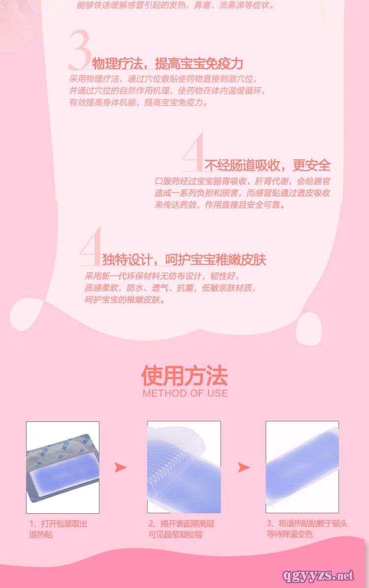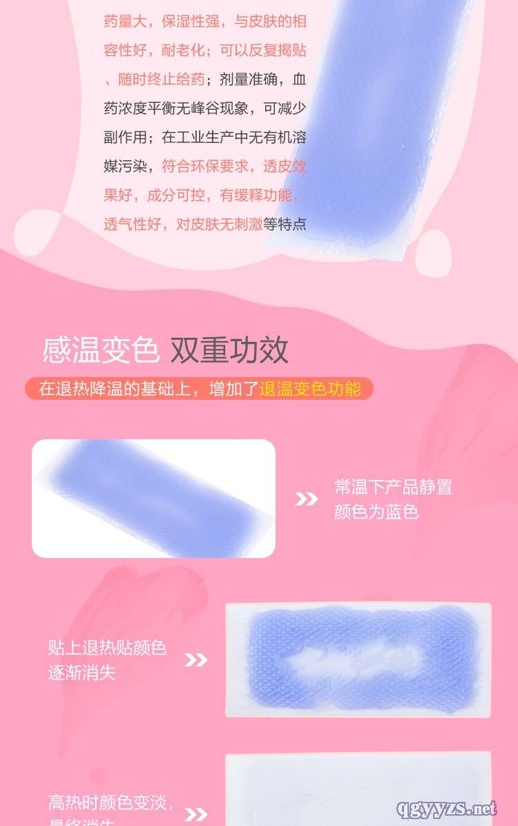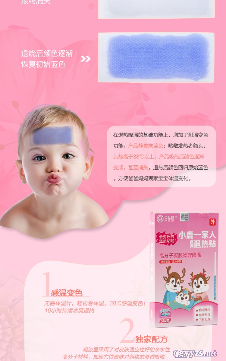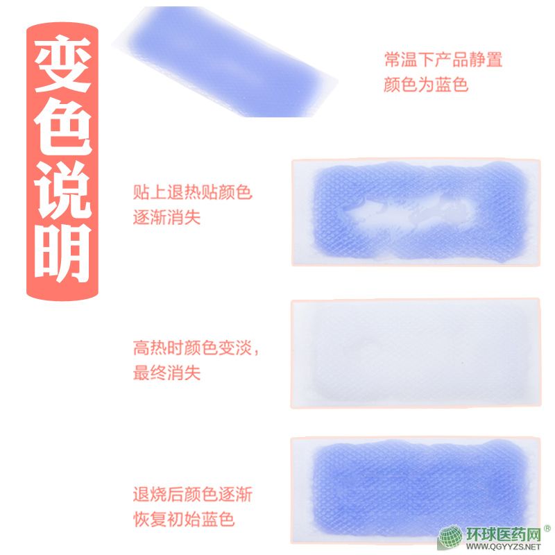 | 產(chǎn)品賣點(diǎn) | 本產(chǎn)品,增加了測(cè)溫變色功能,靜置為藍(lán)色,貼敷發(fā)燒者額頭,當(dāng)發(fā)燒到38°c以上,產(chǎn)品吸熱后可從無(wú)紡布直接看到測(cè)溫膠面顏色逐漸變淡,直到白色透明,退燒后低于38°c,產(chǎn)品由白色變成藍(lán)色,形成高燒變色,低燒恢復(fù)的效果,通過(guò)顏色的變化,方便觀察孩子的發(fā)燒情況 |