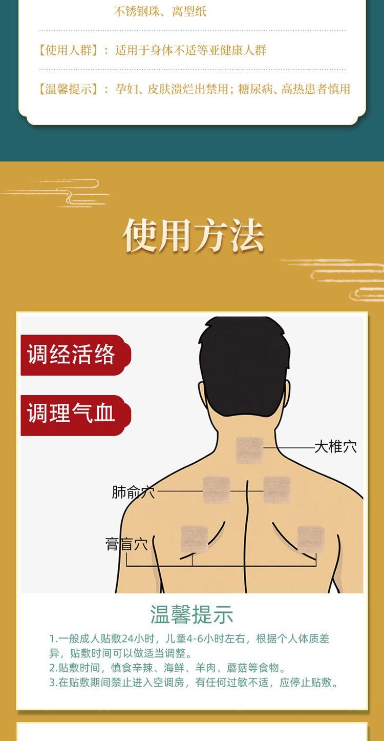 | 使用方法 | 詳見(jiàn)說(shuō)明書(shū)1、清潔相應(yīng)穴位,先以拇指依次揉按相應(yīng)穴位,每次1~2分鐘,范圍由小到大。力量由輕到重,探尋敏感點(diǎn)。2、確認(rèn)包裝無(wú)破損后,打開(kāi)包裝,取出穴位貼敷治療貼,將貼劑的隔離膜撕去,以鋼珠對(duì)準(zhǔn)相應(yīng)穴位敏感點(diǎn)貼壓,1片/穴、天,每日適度按壓3~5次,每次3~5分鐘,1個(gè)療程為10天,療程間隔2~3天。 |