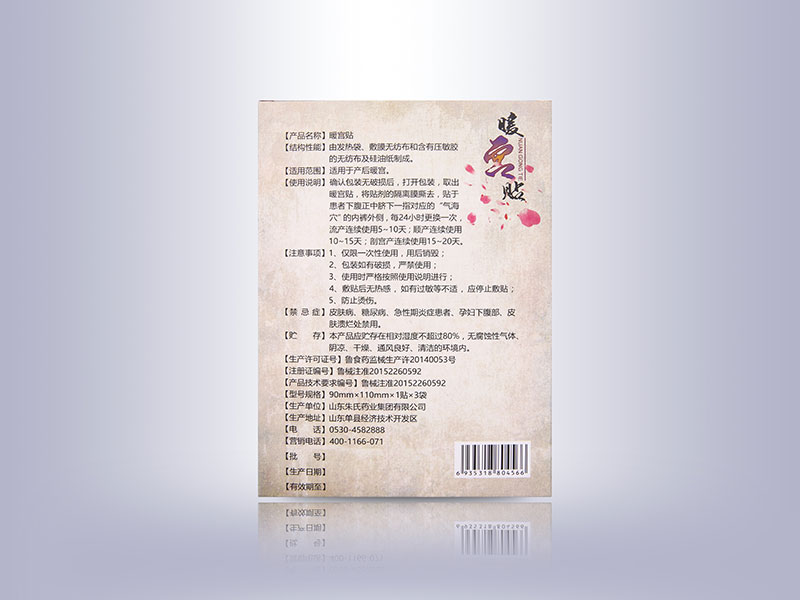 | 使用方法 | 確認(rèn)包裝無損后,打開包裝,取出暖宮貼,將貼劑的隔離膜撕去,貼于患者下腹正中臍下一指對應(yīng)的“氣海穴”的內(nèi)褲外側(cè),每24小時更換一次,流產(chǎn)連續(xù)使用5-10天;順產(chǎn)連續(xù)使用10-15天;剖腹產(chǎn)連續(xù)使用15-20天。 |