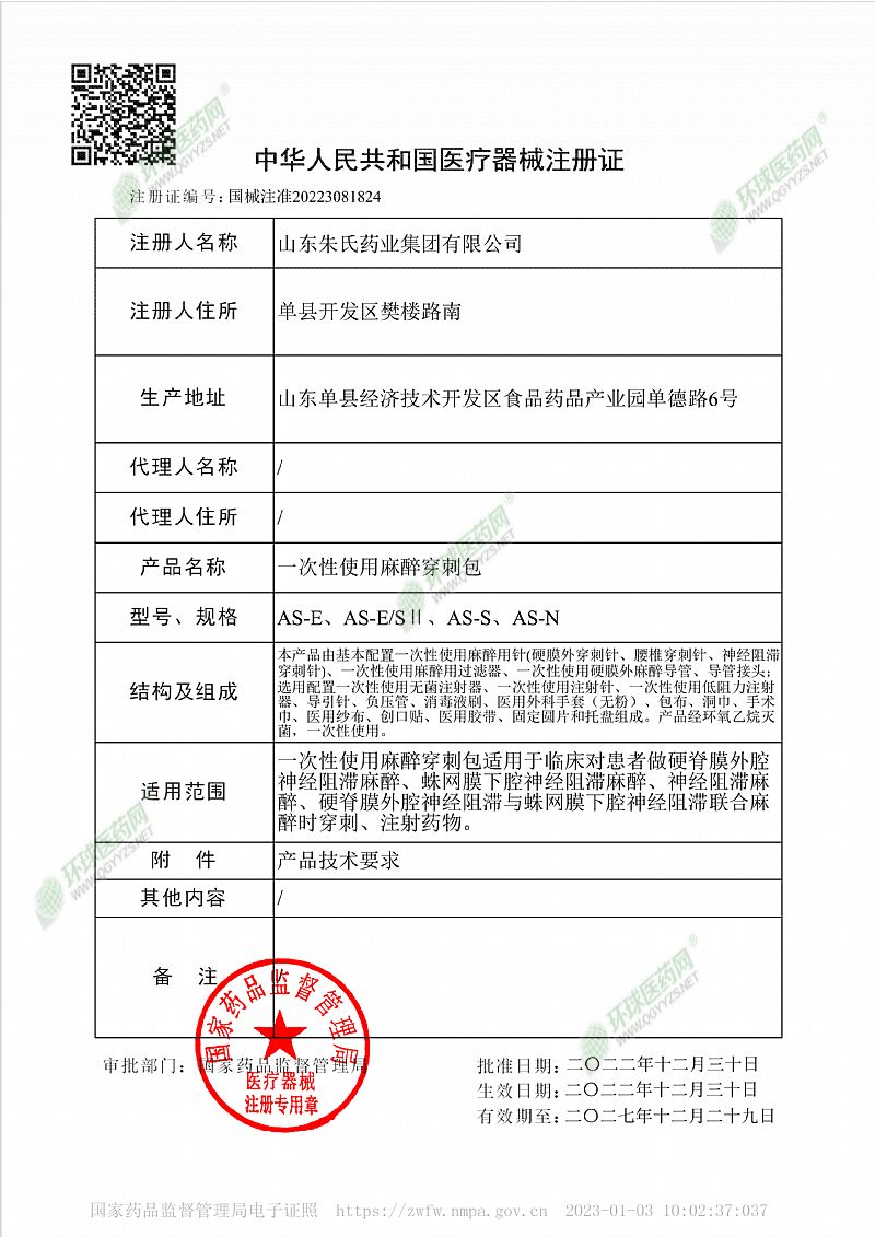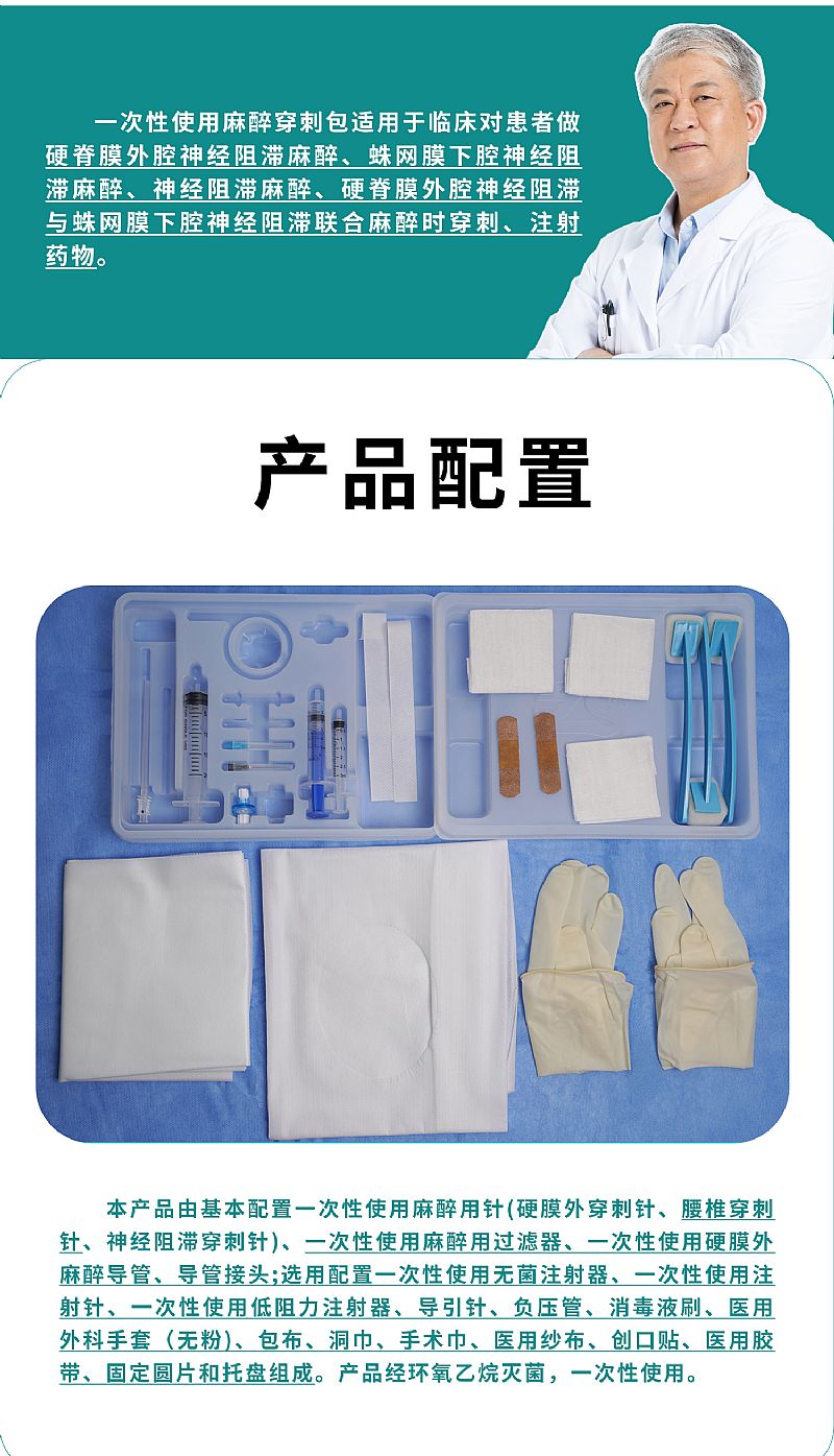 | 產(chǎn)品用途 | 一次性使用麻醉穿刺包適用于臨床對(duì)患者做硬脊膜外腔神經(jīng)阻滯麻醉、蛛網(wǎng)膜下腔神經(jīng)阻滯麻醉、神經(jīng)阻滯麻醉、硬脊膜外腔神經(jīng)阻滯與蛛網(wǎng)膜下腔神經(jīng)阻滯聯(lián)合麻醉時(shí)穿刺、注射藥物。 |