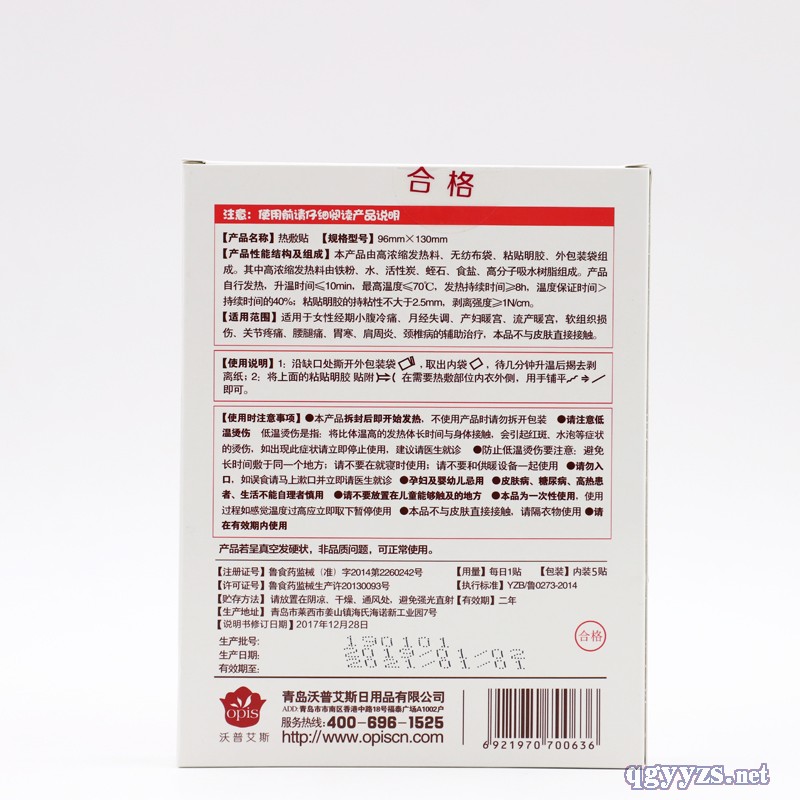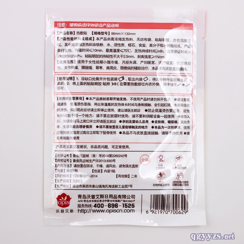 | 補(bǔ)充說明 | 注意事項(xiàng): 本產(chǎn)品拆封后即開始發(fā)熱,不使用產(chǎn)品時(shí)請(qǐng)勿拆開包裝。 1、請(qǐng)注意低溫燙傷,低溫燙傷是指:將比體溫高的發(fā)熱體長(zhǎng)時(shí)間與身體接觸,會(huì)引起紅斑、水泡等癥狀的燙傷,如出現(xiàn)此癥狀請(qǐng)立即停止使用,建議請(qǐng)醫(yī)生就診。 2、防止低溫燙傷要注意:避免長(zhǎng)時(shí)間將暖宮貼敷于同一個(gè)地方;請(qǐng)不要就寢時(shí)實(shí)用;請(qǐng)不要和供暖設(shè)備儀器使用。 3、請(qǐng)勿入口,如誤食請(qǐng)馬上漱口并立即請(qǐng)醫(yī)生就診。 4、孕婦及嬰幼兒忌用。 5、皮膚病、糖尿病、高熱患者、生活不能自理者慎用。 6、請(qǐng)不要放置在兒童能夠觸及的地方。 7、本品為一次性使用,使用過程如感覺溫度過高應(yīng)立即取下暫停使用。 8、本品不與皮膚直接接觸,使用暖宮貼時(shí)請(qǐng)隔衣物實(shí)用。 |