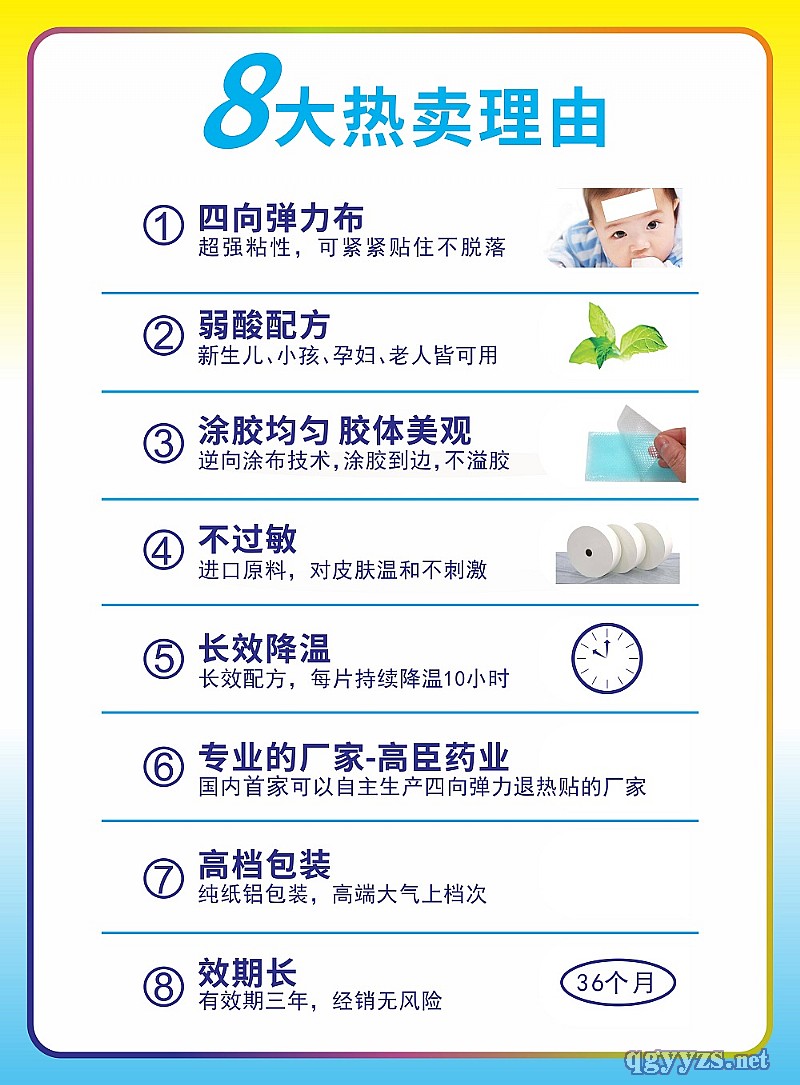| 其它說明 | 1、四向彈力布 超強粘性可緊緊貼信不脫落 2、弱酸配方 溫和不刺激 3、長效降溫,每片持續(xù)降溫10小時 4、涂膠均勻,膠體美觀 4、純紙鋁包裝 ,高端大氣上檔次 5、有效期三年,經(jīng)銷***。 |