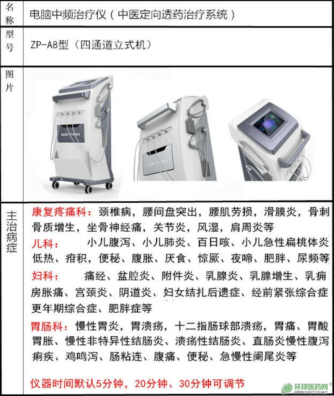 | 其它說明 | 河南邁通醫(yī)療設(shè)備有限公司根據(jù)傳統(tǒng)中醫(yī)藥導(dǎo)理論、結(jié)合人體經(jīng)絡(luò)學(xué)、熱敷穴位原理、生物藥物動力學(xué)及現(xiàn)代微電腦UC技術(shù),運(yùn)用遠(yuǎn)紅外熱療、靶向藥離子導(dǎo)入、中頻脈沖治療技術(shù)、負(fù)壓電流治療等多種治療方式,結(jié)合多年臨床實(shí)踐和大量用戶反饋意見,成功研發(fā)出新一代ZP-A8型中醫(yī)定向透藥治療系統(tǒng)。 |