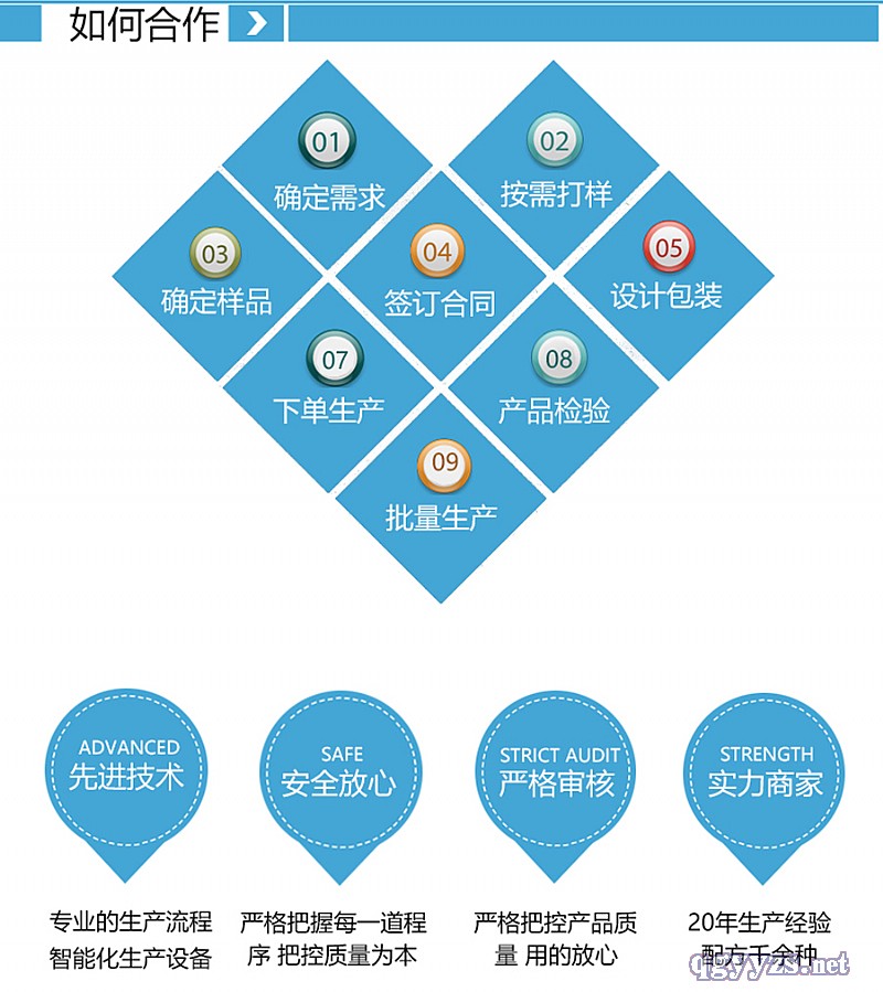 | 產(chǎn)品賣點 | 承接OEM貼牌加工 供原料、成品、半成品、片劑、顆粒劑、軟膠囊、泡騰片等 為每一位客商精打細(xì)算,量身定做…… 為每一位老板做出自己的無形資產(chǎn)--品牌…… 嚴(yán)格按照GMP要求生產(chǎn)、無產(chǎn)品質(zhì)量方面擔(dān)憂、您可專心致力于銷售一線 自主研發(fā)、自主申報,可根據(jù)市場需求及熱點研發(fā)適應(yīng)市場銷售的優(yōu)質(zhì)產(chǎn)品 多年的營養(yǎng)保健品市場經(jīng)驗,顧問式的服務(wù)讓您省心、放心 合同條款限定價格保護(hù),防止客戶惡意擾亂市場 合作方式靈活…… 不管客戶采用何種合作方式,我們都能夠提供周全的服務(wù),盡我們所能,為客戶打造成功品牌! |