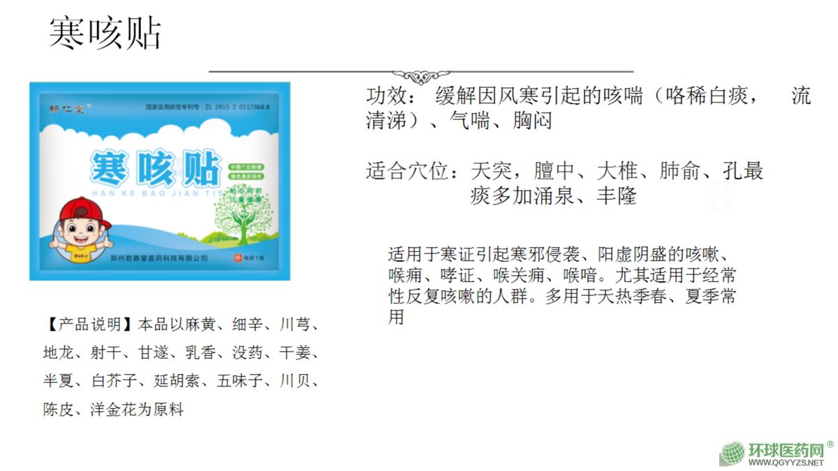 | 補充說明 | 1熱咳保健貼:適用于熱證引起熱邪犯表、肺氣失和所的咳嗽、喉癰、哮證、喉關(guān)癰、喉喑。尤其適用于經(jīng)常性反復咳嗽的亞健康人群br2寒咳保健貼:適用于寒證引起寒邪侵襲、陽虛陰盛的咳嗽、喉癰、哮證、喉關(guān)癰、喉喑。尤其適用于經(jīng)常性反復咳嗽的亞健康人群br3復合咳喘保健貼:適用于咳喘、咳嗽、咽癢、咽喉異物感、聲啞失音、哮證、喉關(guān)癰、喉喑。尤其適用于經(jīng)常性反復咳嗽的亞健康人群br4感冒保健貼:適用于感冒引起的鼻塞、流涕、噴嚏、鼻癢、頭痛、咽癢、咽喉異物感、聲啞失音、哮證、喉關(guān)癰、喉喑。尤其適用于經(jīng)常性反復感冒的亞健康人群br5咽扁保健貼:適用于乳蛾引起的咳嗽、咽癢、咽喉異物感、聲啞失音;哮證、喉癰、喉關(guān)癰、喉喑;尤其適用于經(jīng)常性反復乳蛾的亞健康人群br6退熱保健貼:適用于小兒因風寒、風熱、內(nèi)熱、濕熱引起發(fā)熱的亞健康人群br7腹瀉保健貼:適用于腹瀉、腹部隱痛、腸鳴腹痛、便溏、納差、神疲。大便有粘液、次數(shù)多、量大、大便異常的人群。尤其適用于經(jīng)常性反復腹瀉的亞健康人群br8健脾消食保健貼:適用于脾胃不和引起的不思飲食、消化不良、食少便溏、食積、脾胃虛弱的亞健康人群br9腸胃保健貼:適用溫經(jīng)通絡、散寒止痛;疝氣偏墜,胃寒腹脹、腹痛,小胎寒,積聚痞塊;尤其適用于腸胃紊亂的亞健康人群br10潤腸通便保健貼:適用于便秘的亞健康人群br11減肥保健貼:適用于肥胖的亞健康人群br12頸肩腰腿疼保健貼:適用于風寒濕痹所致的肌肉疼痛、頸椎疼痛、腰椎疼痛、四肢關(guān)節(jié)疼痛、寒濕引起**疼痛不適的人群;尤其適用頸肩腰腿疼的亞健康人群br |
