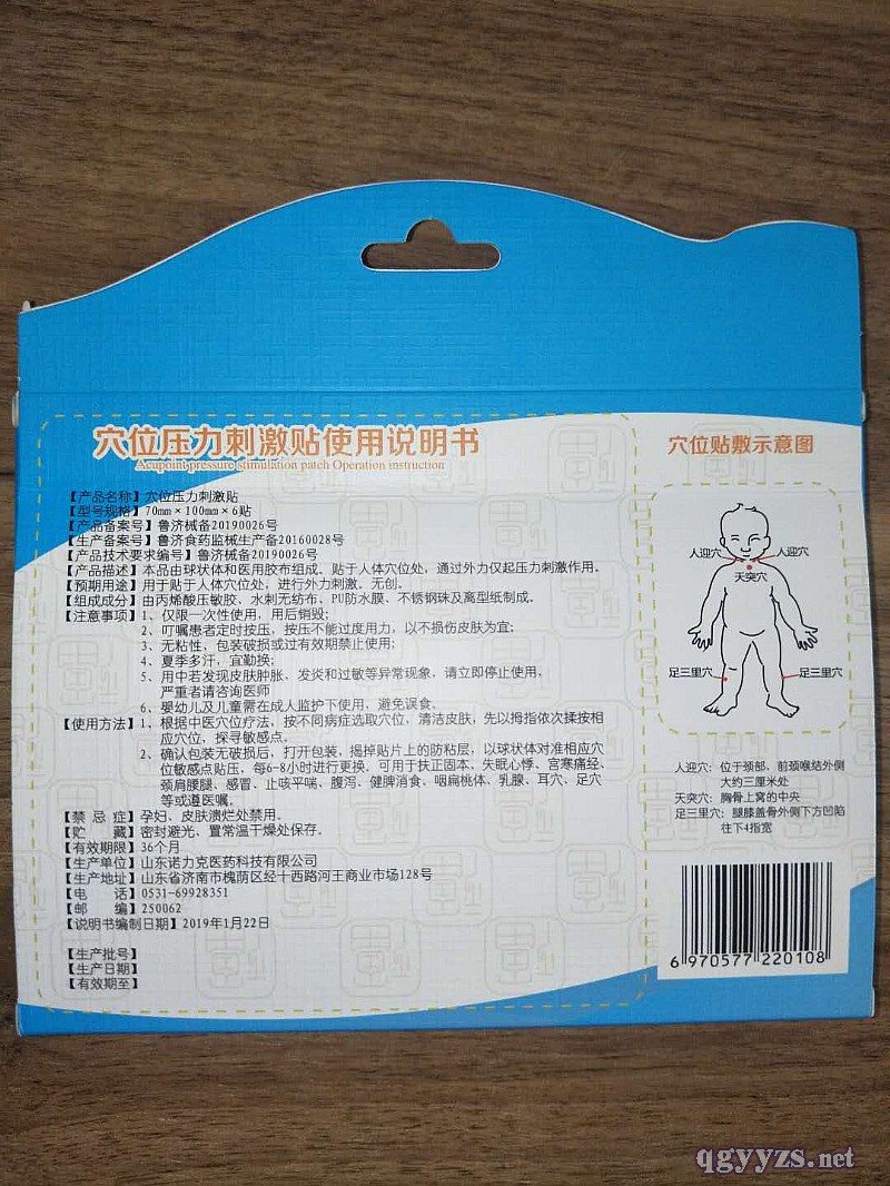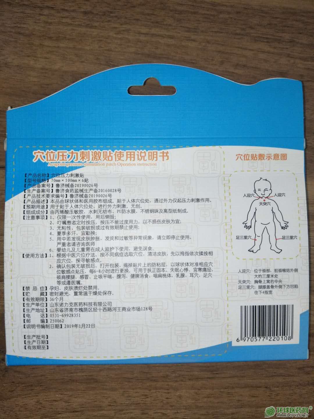 | 補(bǔ)充說明 | 【型號規(guī)格】70mm*10mm*6貼 【產(chǎn)品備案號】魯濟(jì)械備20190026號 【生產(chǎn)備案號】魯濟(jì)食藥械生產(chǎn)備20160028복 【產(chǎn)品技術(shù)要求編號】魯濟(jì)械備20190026號 【產(chǎn)品描述】本品由球狀體和醫(yī)用膠布組成,貼于人體穴位處,通過外力僅起壓力刺激作用 【預(yù)期用途】用于貼于人體穴位處,進(jìn)行外力刺激,無創(chuàng) 【組成成分】由丙烯酸壓敏膠,水刺無紡布、PU防水膜,不銹鋼珠及離型紙制成 【注意事項(xiàng)】1,僅一次性使用,用后銷毀 2,叮囑患者定時(shí)按壓,按壓不能過度用力,以不損傷皮膚為宜 3,無粘性,裝損或過有效期禁止使用 4.夏季多汗,宜勤換 5用中若發(fā)規(guī)皮膚腫脹,發(fā)炎和過敏等異,F(xiàn)象,請立即停止使用,嚴(yán)重者請咨詢醫(yī)師 6、嬰幼兒及兒童需在成人監(jiān)護(hù)下使用,避免誤食 【使用方法】1、根據(jù)中醫(yī)穴位療法,按不同病癥選取穴位清潔皮膚、先以拇指依次揉按相應(yīng)穴位,探尋敏感點(diǎn) 2,確認(rèn)包裝無破損后,打開包裝,揭掉貼片上的防粘層,以球狀體對準(zhǔn)相應(yīng)穴 位敏感點(diǎn)貼壓,每6-8小時(shí)進(jìn)行更換,可用于扶正固本,失眠心悸,宮寒痛經(jīng) 頸肩腰腿、感冒,止咳平喘,腹瀉,健脾消食,咽扁桃體,乳腺,耳穴,足穴等或遵醫(yī)囑 【禁忌癥】孕婦,皮膚潰爛處禁用 【貯藏】密封避光,置常干燥處保存 【有效期】36個(gè)月 【生產(chǎn)單位】山東諾力克醫(yī)藥科技有限公司 【生產(chǎn)地址】山東省濟(jì)南市槐蔭區(qū)經(jīng)十西路河王商業(yè)市128號 |
