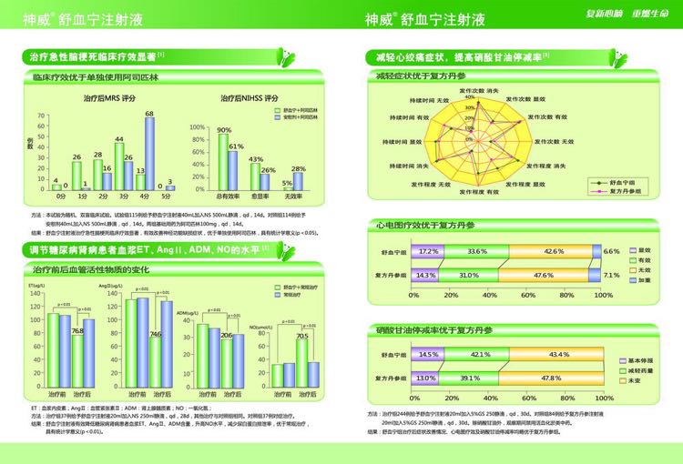 | 功能主治 | 治療急性腦梗死臨床療效** 調節(jié)糖尿病腎病患者血漿ET.Angll.ADM.NO水平 減輕心絞痛癥狀,提高硝酸甘油停減率 |